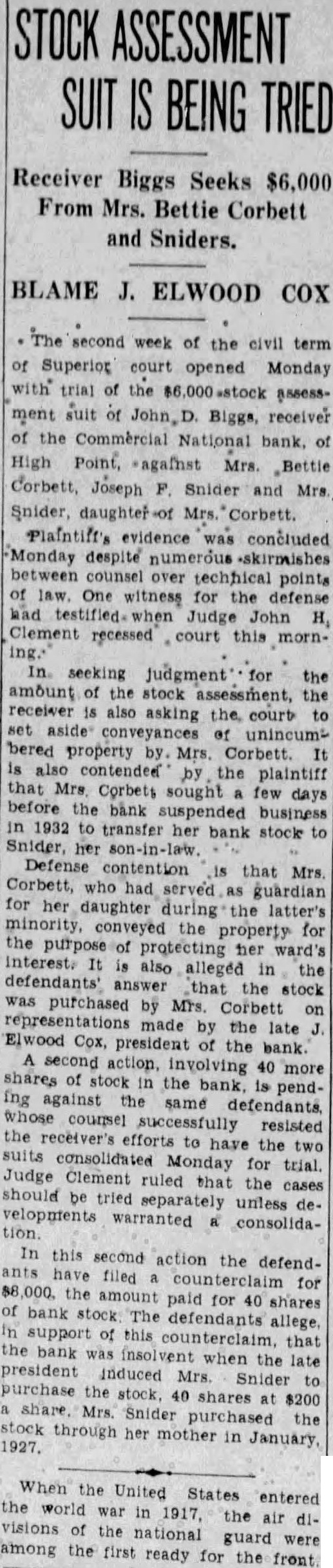 BLAME J. ELWOOD COX second week of the civil term Superior court opened Monday with trial of the assessment suit receiver Biggs, of the Commercial National bank. of High Point, Mrs. Bettle Corbett, Joseph Snider and Snider, Mrs. Corbett. Plaintiff's evidence concluded Monday despite between counsel over points One witness for the defense had Judge John H, Clement recessed court this mornseeking for the amount of the assessment, the receiver also asking the court set conveyances unincumbered property Mrs. the plaintiff that Mrs. Corbets sought few days before the bank suspended business in 1932 transfer bank stock to Snider, her Defense contention that Mrs. Corbett, who had served guardian for daughter the latter's minority, conveyed the property for interest. the purpose protecting her ward's It also alleged in the defendants' answer that the stock was purchased by Mrs. Corbett on representations made the late Elwood Cox, president of the bank. action, involving 40 more shares of the bank. pending against same whose successfully resisted the to have the Judge consolidated Monday for trial. two Clement ruled the should velopments be tried separately unless cases dewarranted consolidation. In this second action the defendfiled for the amount paid for 40 shares bank The defendants allege, support this that bank the late president induced Mrs. Snider purchase the share. Snider $200 through her mother in 1927.