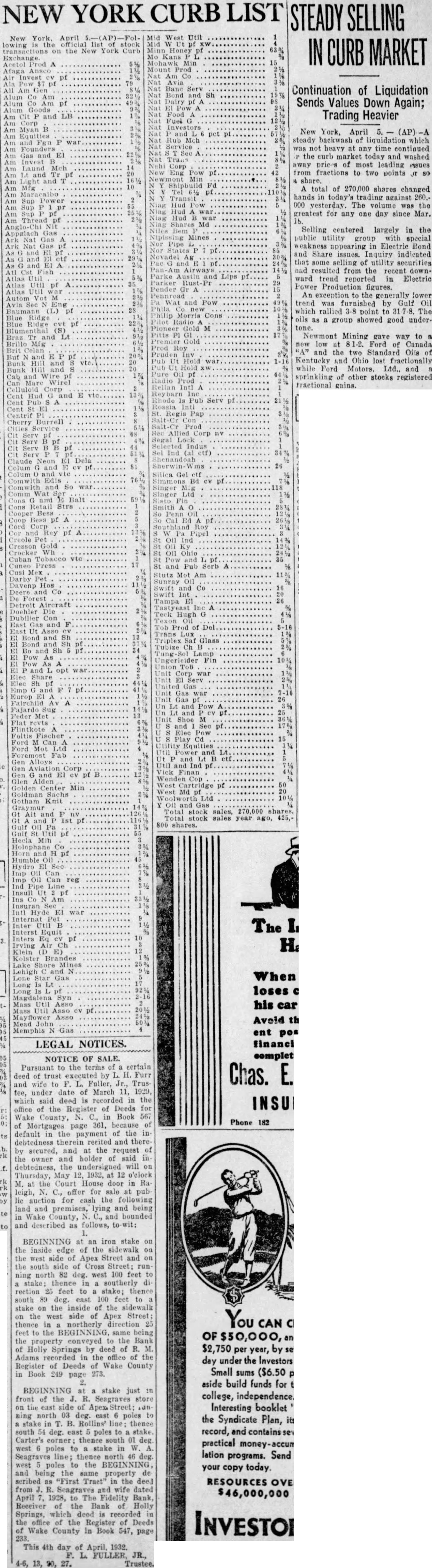 NEW YORK CURB LIST STEADY SELLING New York, April West Util list stock Ut the New York Curb Minn Honey IN CURB MARKET Kans Min Ansco Mount Invest Avia Am and Sh Co Am Alum Goods Am and LB Mch Founders Invest Pow pf Fd Sup Power war Thread Shares Md Nit Mines Airways Austin and Lips Util Pender Gr A Wat and Pow Morris Cons Radio Ridge Gold M Lt Pruden Hold Hold Oil Cab Wirel Prod Cent Serv Pap Centrif Burrell Prod Corp nv Indus Serv Ind Claude Neon Dela CV and and and Balt Strs Bess A Rey Pipel Tobacco vtc and Press Serb Mot Am Hos Co Co Forest Detroit Aircraft A East Tob Del Asso Lux Bond Saf Glass and Ch Lamp Pow Fin opt war Share Serv Sh war Europ and Elec Pow Play Cd Equities Mot Power and Foremost Fab and B ctf Gen and Ind Aviation Corp Finan and West Center Min Md Knit Y sales, 270,000 and stock sales year 425,1st pf shares. Min Co Horn and pf Imp Can reg Insull pf Ins Co war Internat Util Equit Eq Ch Klein E) Brandes Lake Shore Lehigh N Lone Star Gas Long Is Syn Asso his car Util Asso Asso Mead Memphis Gas Continuation of Liquidation Sends Values Down Again; Trading Heavier New York, April 5. (AP) steady backwash of which was not heavy at any time continued P the curb market today and washed away prices of most leading *isues from fractions to two points JT 80 share. A total of 270,000 shares changed hands in today's trading against 260.000 yesterday. The volume was the greatest for any one day since Mar. Selling centered largely in the public utility group with special weakness appearing in Electric Bond and Share issues. Inquiry indicated that some selling of utility securities had resulted from the recent downward trend reported in Electric Power Production figures. An exception to the generally |ower trend was furnished by Gulf Oil which rallied 3-8 point to 31 7-8. The oils as a group showed good undertone. Newmont Mining gave way to new low at 81-2. Ford of Canada and the two Standard Oils Kentucky and Ohio lost fractionally while Ford Motors. Ltd.. and sprinkling of other stocks registered tractional gains LEGAL NOTICES. NOTICE OF SALE. Pursuant to the terms of a certain deed of trust executed by L. H. Furr and wife to F. L. Fuller, Jr., Trus tee, under date of March 11, 1929, which said deed is recorded in the office of the Register of Deeds Wake County, N. Book of Mortgages page 361, because default in the payment of the in debtedness therein recited and there by secured, and at the request the owner and holder of said in debtedness, the undersigned will on Thursday, May 12, 1932, at 12 o'clock M. at the Court House door in Ra leigh, N. C., offer for sale at pub lie auction for cash the following land and premises, lying and being in Wake County, and bounded and described as follows, to wit: BEGINNING at an iron stake on the edge of the sidewalk the west side of Apex Street and on the south side of Cross Street run ning north 82 deg. west 100 feet to stake: in southerly rection 25 feet to stake; thene south 89 deg. east 100 feet to stake on the inside of the sidewalk on the west side of Apex Street thence in northerly 25 feet to the BEGINNING, same being the property conveyed to the Bank Holly Springs by deed of R. Adams recorded in the office of the Register of Deeds of Wake County in Book 249 page 273. BEGINNING at a stake just college, independence. front of the J. R. Seagraves store on the east side of Apex. Street; an ning north 03 deg. east poles stake T. B. Rollins' line: thence south 54 deg. east 5 poles to stake record, and contains seven Carter's corner; thence south 01 deg practical money-accumupoles to stake in W Seagraves line thenee north 46 deg lation programs. Send for west poles to the BEGINNING, your copy today. being same property de scribed as "First Tract' in the deed RESOURCES OVER from J. R. and wife dated $46,000,000 April 7, 1928, to The Fidelity Bank, Receiver of the Bank of Holly Springs, recorded in the office of the Register of Deeds Wake County in Book 547, page This 4th day of April, 1932. L. JR., 13, 27. Trustee.