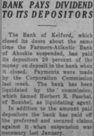 The Bank of Kelford, of our sister county, has paid its depositors twenty percent of their money on deposit when the bank closed in January. Stockholders and depositors in the local bank, a suspended business along about the same time, have shown an unusual spirit of tolerance and confidence in the management of the bank's affairs during the eight months period.