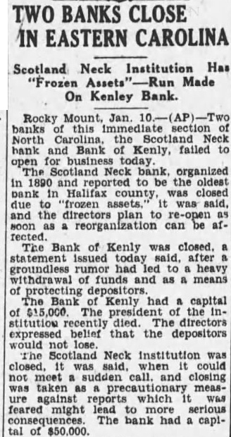 TWO BANKS CLOSE IN EASTERN CAROLINA Scotland Neck Institution Has Assets" Made On Kenley Bank Rocky Mount, Jan. banks this North the bank and Bank Kenly, failed open for Scotland Neck bank. organized 1890 and to the oldest Halifax county, closed and the reorganization can be af. rected. The Bank of Kenly was closed. issued after groundless rumor had heavy withdrawal funds as means of protecting The Bank Kenly had capital of The the stitution directors expressed that the depositors The Scotland Neck institution was closed, when could meet sudden and closing was taken measagainst which lead serious The bank had capital of $50,000.