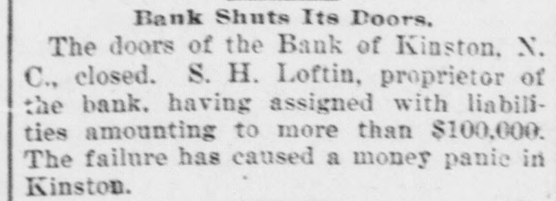 Bank Shuts Its Doors. The doors of the Bank of Kinston. N. C., closed. S. H. Loftin, proprietor of the bank. having assigned with liabilities amounting to more than $100,000. The failure has caused a money panic in Kinston.