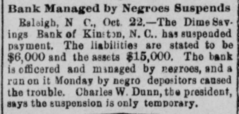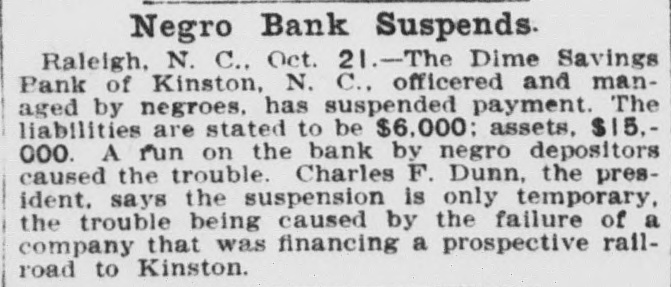 A bank officered and managed by negroes is in trouble. It is the dime savings bank, of Kinston, N. C., which has suspended payment. The liabilities are stated to be $6,000, assets $15,000. A run on the bank by negro depositors caused the trouble. Charles F. Dunn, the president, who for years has been a leader of the negroes in politics and finance, says the suspension is only temporary, the trouble being caused by the failure of a company that was financing a prospective railroad to Kinston.