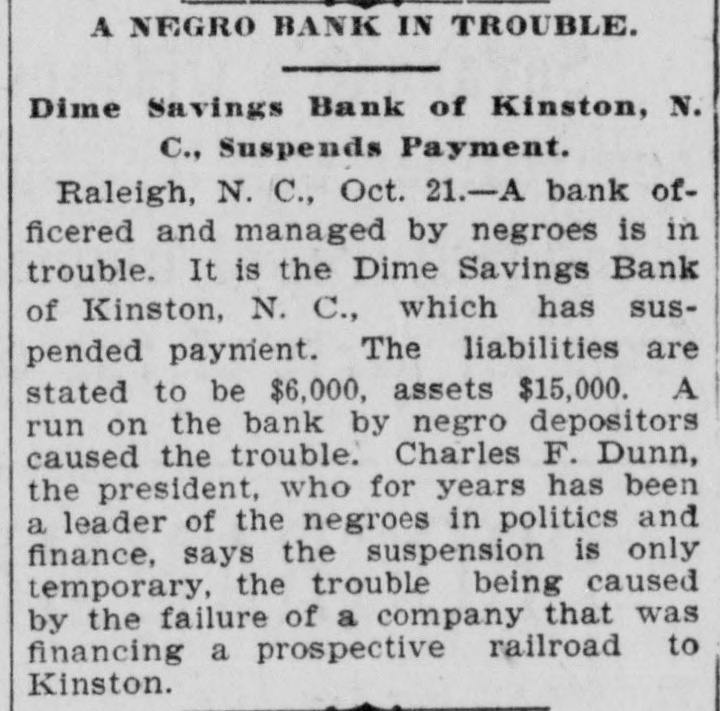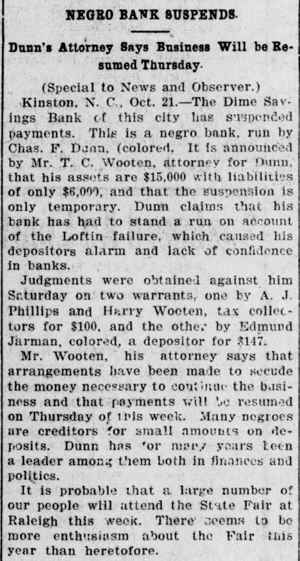 NEGRO BANK SUSPENDS. Dunn's Attorney Says Business Will be Resumed Thursday. (Special to News and Observer.) Kinston, N. C., Oct. 21.-The Dime Savings Bank of this city has suspended payments. This is a negro bank, run by Chas. F. Dunn, (colored. It is announced by Mr. T. C. Wooten, attorney for Dunn, that his assets are $15,000 with liabilities of only $6,000, and that the suspension is only temporary. Dunn claims that his bank has had to stand a run on account of the Loftin failure, which caused his depositors alarm and lack of confidence in banks. Judgments were obtained against him Saturday on two warrants, one by A. J. Phillips and Harry Wooten, tax collectors for $100, and the other by Edmund Jarman, colored, a depositor for $147. Mr. Wooten, his attorney says that arrangements have been made to secude the money necessary to continue the basiness and that payments will be resumed on Thursday of tris week. Many negroes are creditors for small amounts on deposits. Dunn has 'or mary years been a leader among them both in finances and politics. It is probable that a large number of our people will attend the State Fair at Raleigh this week. There' seems to be more enthusiasm about the Fair this year than heretofore.