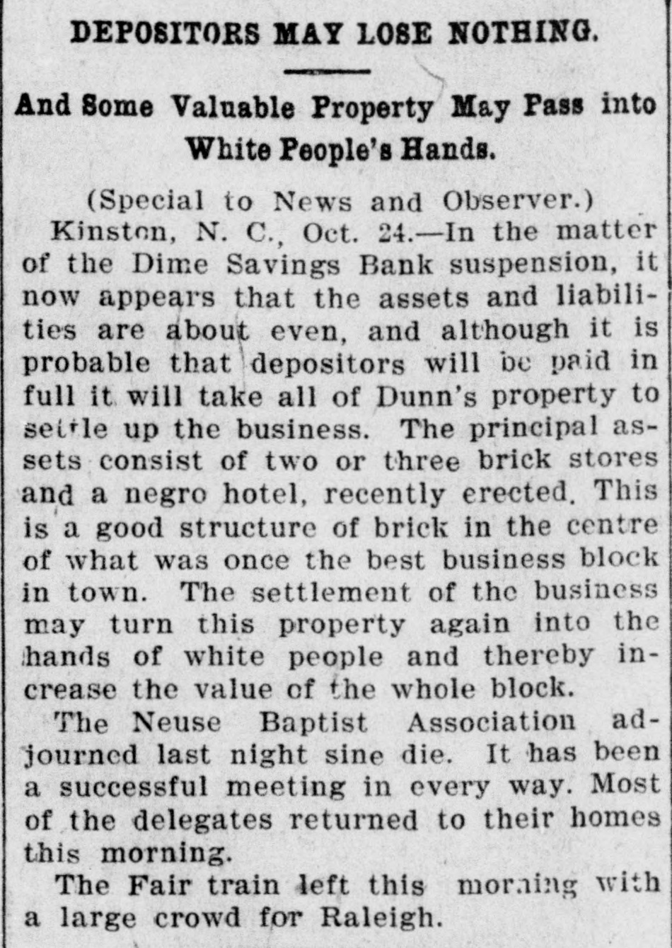 DEPOSITORS MAY LOSE NOTHING. And Some Valuable Property May Pass into White People's Hands. (Special to News and Observer.) Kinston, N. C., Oct. 24.-In the matter of the Dime Savings Bank suspension, it now appears that the assets and liabilities are about even, and although it is probable that depositors will be paid in full it will take all of Dunn's property to settle up the business. The principal assets consist of two or three brick stores and a negro hotel, recently erected. This is a good structure of brick in the centre of what was once the best business block in town. The settlement of the business may turn this property again into the hands of white people and thereby increase the value of the whole block. The Neuse Baptist Association adjourned last night sine die. It has been a successful meeting in every way. Most of the delegates returned to their homes this morning. The Fair train left this morning with a large crowd for Raleigh.