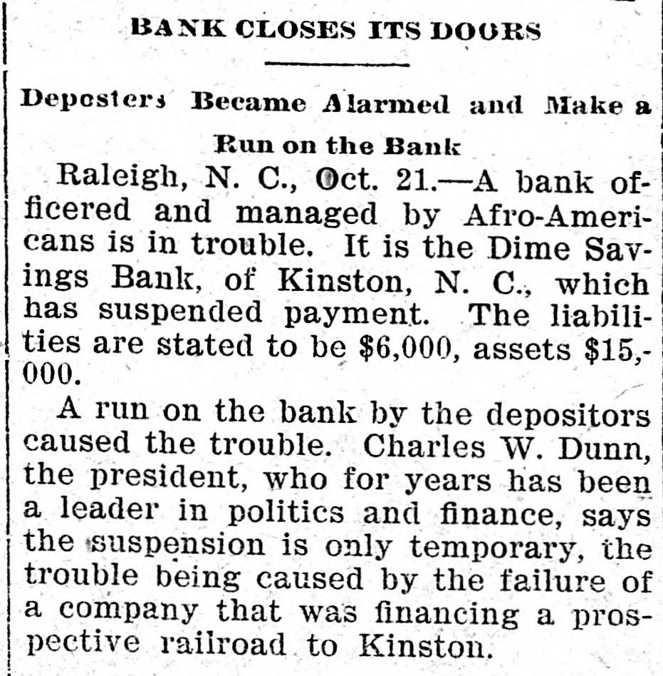 BANK CLOSES ITS DOORS Deposters Became Alarmed and Make a Run on the Bank Raleigh, N. C., Oct. 21.-A bank officered and managed by Afro-Americans is in trouble. It is the Dime Savings Bank, of Kinston, N. C., which has suspended payment. The liabilities are stated to be $6,000, assets $15,000. A run on the bank by the depositors caused the trouble. Charles W. Dunn, the president, who for years has been a leader in politics and finance, says the suspension is only temporary, the trouble being caused by the failure of a company that was financing a prospective railroad to Kinston.
