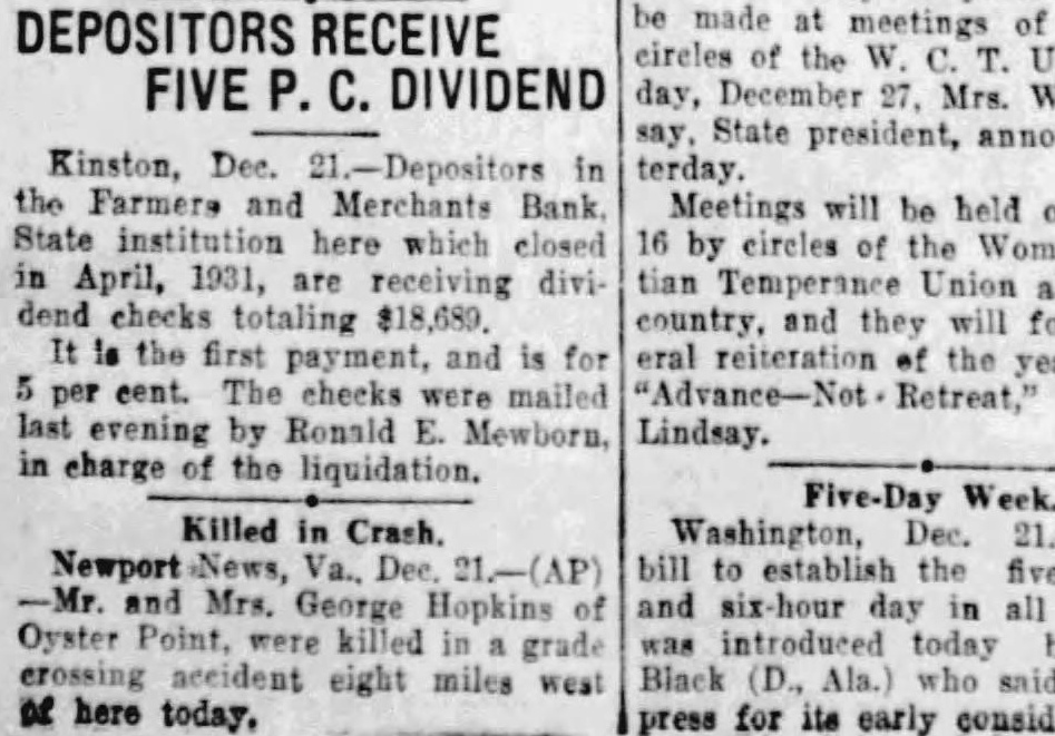 DEPOSITORS RECEIVE circles of the W. U. on Tues FIVE C. DIVIDEND Kinston, Dec. 21.-Depositors in terday. the Farmers and Merchants Bank, State institution here which closed in April, 1931, are receiving dividend checks totaling $18,689. It is the first payment, and is for 5 per cent. The checks were mailed last evening by Ronald E. Mewborn, Lindsay. in charge of the liquidation. Killed in Crash. Mrs. George Hopkins of Oyster Point, were killed in grade eight miles west of here press for its early consideration,
