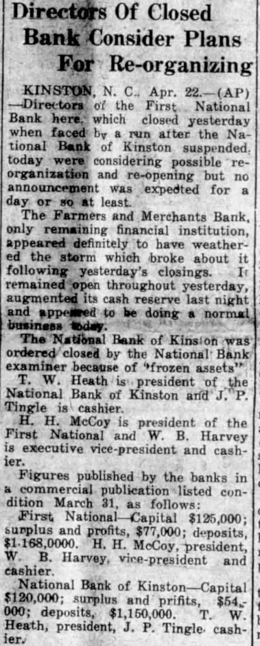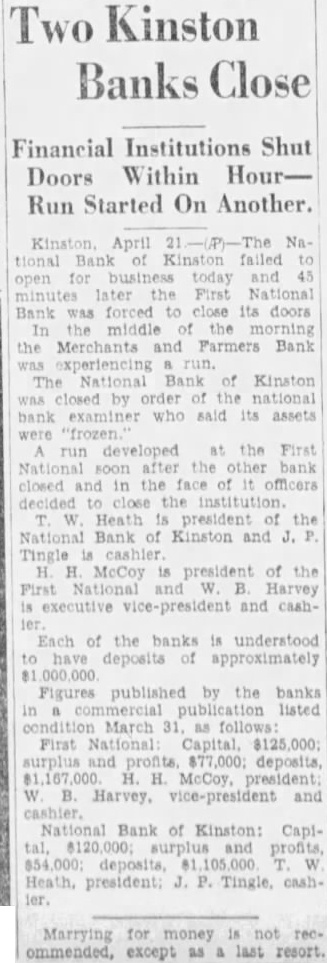 Kinston, April tional Bank Kinston failed business National Bank forced its doors middle the Merchants and Farmers Bank experiencing The National Bank Kinston closed by order the national examiner who said assets developed National the other closed the officers decided Heath president National Bank of Kinston and Tingle McCoy president of the First National and Harvey executive vice-president and