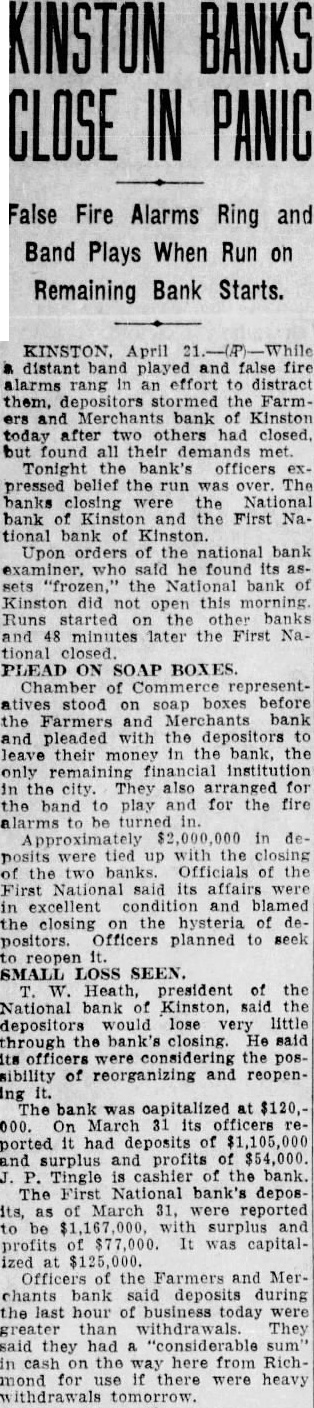 KINSTON. April distant band played and false fire alarms rang In an effort to distract them, depositors stormed the Farmers and Merchants bank of Kinston today after two others had closed. but found all their demands met. Tonight the bank's officers ex. pressed belief the run was over. The banks closing were the National bank of Kinston and the First National bank of Kinston Upon orders of the national bank examiner. who said he found its assets "frozen," the National bank of Kinston did not open this morning. Runs started on the other banks and 48 minutes later the First National closed. PLEAD ON SOAP BOXES. Chamber of Commerce representatives stood on soap boxes before the Farmers and Merchants bank and pleaded with the depositors to leave their money in the bank, the only remaining financial institution in the city. They also arranged for the band to play and for the fire alarms to be turned in. Approximately in deposits were tied up with the closing of the two banks. Officials of the First National said its affairs were in excellent condition and blamed the closing on the hysteria of depositors. Officers planned to seek to reopen SMALL LOSS SEEN. W. Heath, president of the National bank of Kinston, said the depositors would lose very little through the bank's closing. He said its officers were considering the possibility of reorganizing and reopening it. The bank was capitalized at $120,000. On March 31 its officers reported it had deposits of $1,105,000 and surplus and profits of $54,000. J. P. Tingle is cashier of the bank. The First National bank's deposits, as of March 31, were reported to be $1,167,000. with surplus and profits of $77,000. It was capitalized at $125,000. Officers of the Farmers and Merchants bank said deposits during the last hour of business today were greater than withdrawals. They said they had "considerable sum" in cash on the way here from Richmond for use if there were heavy withdrawals tomorrow.