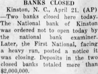 Kinston, April banks closed here today and officers of the only one turned to drastic to save in the face which brass band, soap orators and false fire alarms failed The National Bank, of Kinston, was ordered today by the open minutes after the First National Bank. facing heavy runs, posted note was closing similar run was in progress the Farmers and Merchants Bank, which, however, was still withstanding the inroads of withdrawals at Deposits in the closed banks totaled more than $2,000,000.