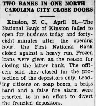 Kinston, N. C., April 21.-The National Bank of Kinston failed to open for business today and fortyeight minutes after the opening hour, the First National Bank closed against a heavy run. Frozen loans were given as the reason for closing the latter bank. The officers said they closed for the protection of the depositors only. Leading citizens on soap boxes, a brass band and a false fire alarm were resorted to in an effort to divert the frenzied depositors.