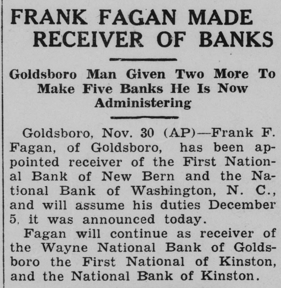 FRANK FAGAN MADE RECEIVER OF BANKS Goldsboro Man Given Two More To Make Five Banks He Is Now Administering Goldsboro, Nov. 30 (AP)-Frank F. Fagan, of Goldsboro, has been appointed receiver of the First National Bank of New Bern and the National Bank of Washington, N. C., and will assume his duties December 5, it was announced today. Fagan will continue as receiver of the Wayne National Bank of Goldsboro the First National of Kinston, and the National Bank of Kinston.