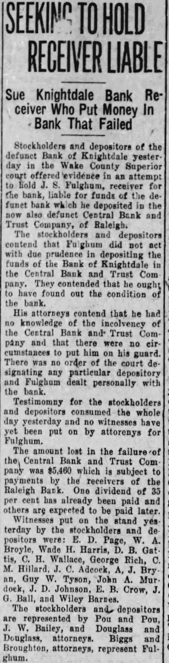 Sue Knightdale Bank ceiver Who Put Money In Bank That Failed and depositors of the defunct Bank Knightdale yester day the Wake County Superior in attempt Fulghum, the liable for Central Company, of Raleigh. The depositors that did not with due funds the Bank Knightdale the Central Bank and Trust Com They that he found out the condition the attorneys contend that he had knowledge the Central and Trust pany and that cir put him There was court any dealt with the Testimomny for the stockholders depositors the whole day yesterday and put by attorenys for The amount in the the Central and Trust pany was is subject the the Raleigh One dividend of has already paid and are put the stand terday by the Page, Broyle, Wade H. Harris, tis, George Hillard Guy Tyson, Mur Crow, and Wiley Barnes. represented by and Pou, Bailey, Douglass and Douglass, attorneys. Biggs attorneys, represent Fulghum.
