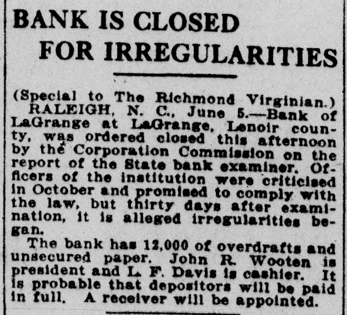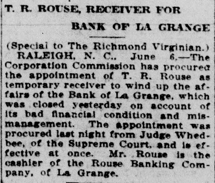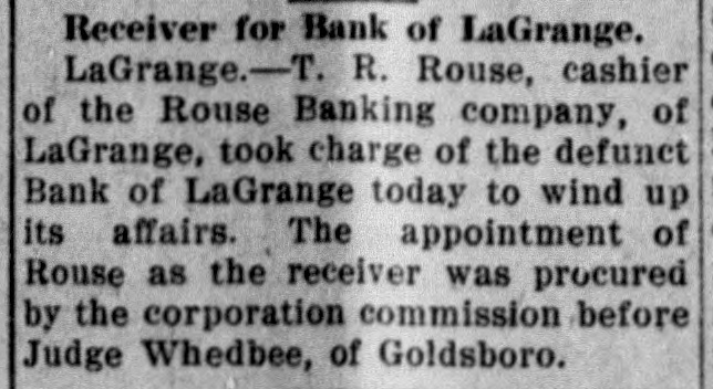 The Corporation Commission has procured the appointment of T. R. Rouse as temporary receiver to wind up the affairs of the Bank of La-Grange, closed yesterday on account of bad financial condition and mismanagement. The appointment was procured last night from Judge Whedbee, at Goldsboro, and is effective at once. Rouse has been for quite a while cashier of the Rouse Banking Company, of LaGrange. It is not expected that any of the depositors will lose anything by the closing of the bank.