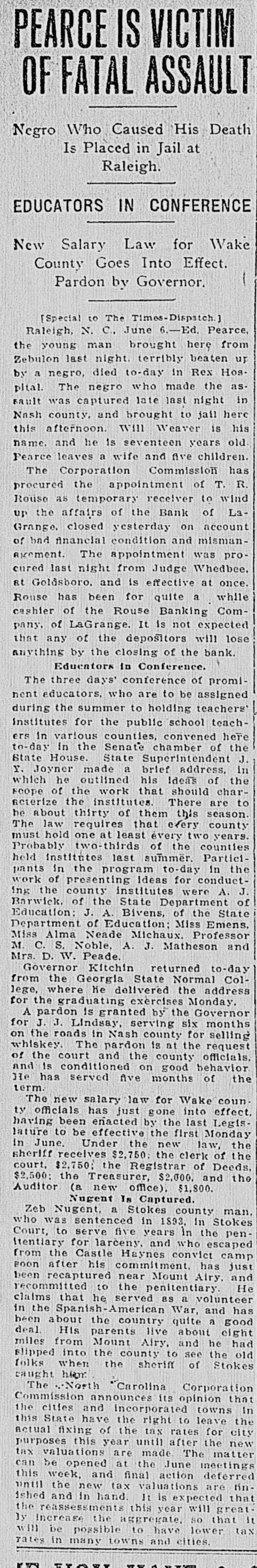 Raleigh, N. C., June 6.-Ed. Pearce, the young man brought here from Zebulon last night, terribly beaten up by a negro, died to-day in Rex Hospital. The negro who made the assault was captured late last night in Nash county, and brought to jail here this afternoon. Will Weaver is his name, and he is seventeen years old. Pearce leaves a wife and five children.