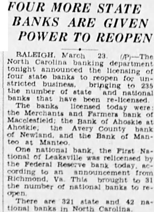 FOUR MORE STATE BANKS ARE GIVEN POWER TO REOPEN March 23 Carolina department tonight the of licensing banks reopen for bringing 235 the number banks that re-licensed banks licensed today the Merchants Farmers bank Bank Ahoskie bank and the Bank of ManOne national the First tional Leaksville was relicensed the Federal Reserve bank today cording from the number of national banks There are 321 42 tional banks in North Carolina