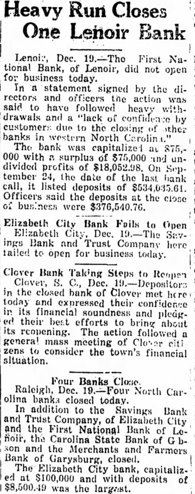 Heavy Run Closes One Lenoir Bank ... First National Bank, Lenoir, did not open for business today. Statement signed by the directors said the action was due to heavy withdrawals and 'lack of confidence' due to the closing of other North Carolina banks.
