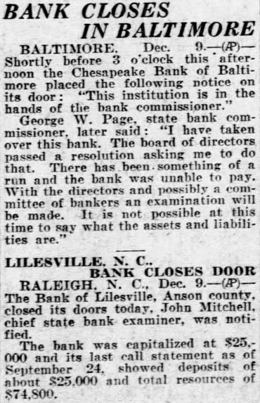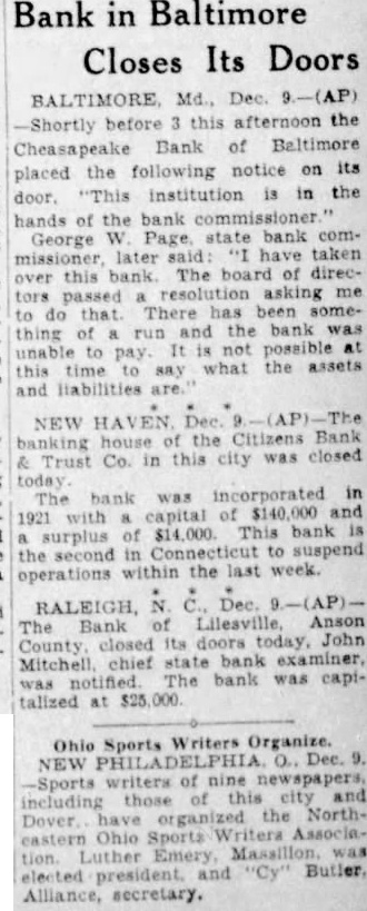 Bank in Baltimore Closes Its Doors Shortly before 3 this the Cheasapeake Bank of Baltimore placed the following notice on its door. "This institution is in the hands of the bank commissioner George Page state bank commissioner later have taken over this bank The board of directors passed resolution asking me to do that There has and the bank was thing of run unable to pay It not possible this time say what the assets and liabilities are. NEW HAVEN Dec. The the Citizens Bank banking & Trust Co. in this city was closed today incorporated in The bank was 1921 with capital of $140,000 and surplus of $14,000. This bank the second in Connecticut to suspend operations within the last week. Bank of Lilesville, Anson County closed its doors today, John Mitchell chief state bank examiner, capiThe bank was talized $25,000 Ohio Sports Writers Organize. NEW O. 9. -Sports writers of nine and those this including Dover the NorthOhio Sports AssociaLuther and Alliance, secretary.