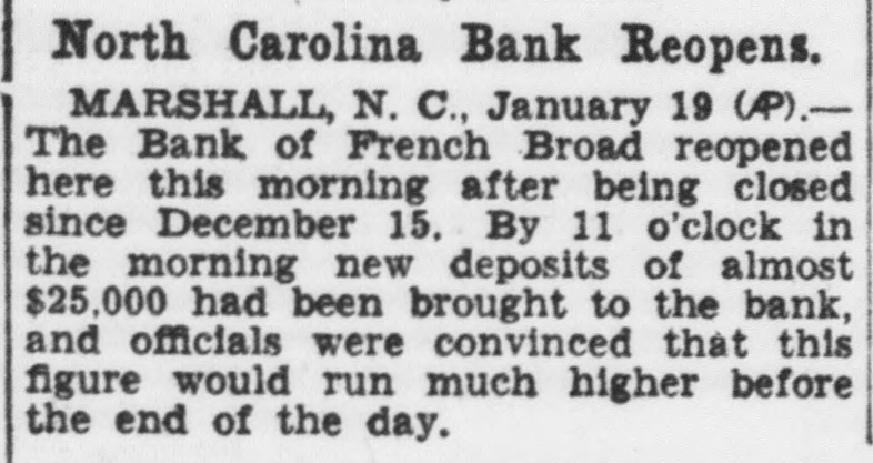 North Carolina Bank Reopens. MARSHALL, N. C., January 19 (P).The Bank of French Broad reopened here this morning after being closed since December 15, By 11 o'clock in the morning new deposits of almost $25,000 had been brought to the bank, and officials were convinced that this figure would run much higher before the end of the day.