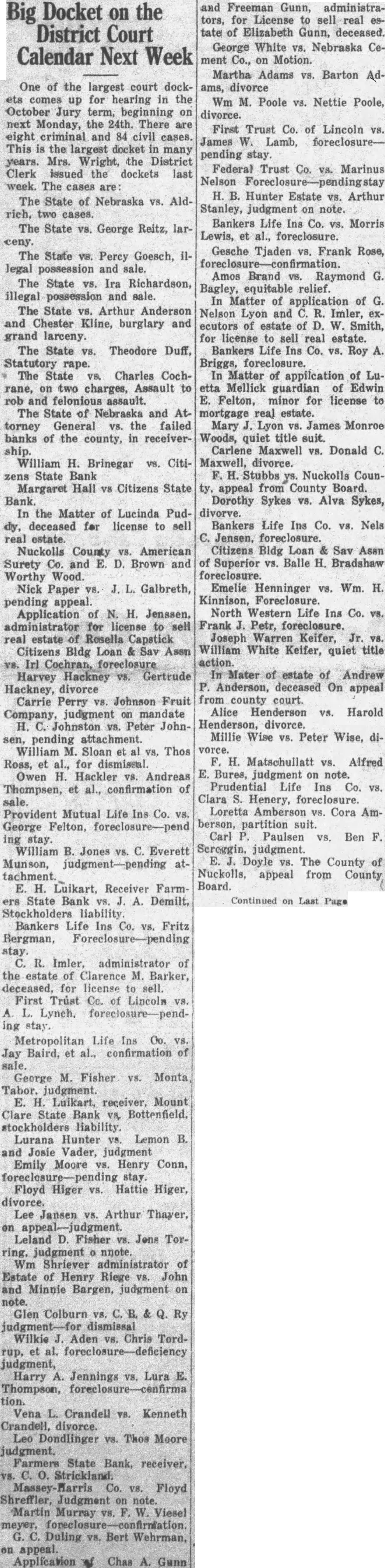 One of the largest court dockets comes up for hearing in the October Jury term, beginning on next Monday, the 24th. There are eight criminal and 84 civil cases. This is the largest docket in many years. Mrs. Wright, the District Clerk issued the dockets last week. The cases are: The State of Nebraska vs. Aldrich, two cases. The State VS. George Reitz, larceny. The State VS. Percy Goesch, illegal possession and sale. The State VS. Ira Richardson, illegal possession and sale. The State vs. Arthur Anderson and Chester Kline, burglary and grand larceny. The State vs. Theodore Duff, Statutory rape. The State VS. Charles Cochrane, on two charges, Assault to rob and felonious assault. The State of Nebraska and Attorney General vs. the failed banks of the county, in receivership. William H. Brinegar VS. Citizens State Bank Margaret Hall vs Citizens State Bank. In the Matter of Lucinda Puddy, deceased for license to sell real estate. Nuckolls County VS. American Surety Co. and E. D. Brown and Worthy Wood. Nick Paper vs. J. L. Galbreth, pending appeal. Application of N. H. Jenssen. administrator for license to sell real estate of Rosella Capstick Citizens Bldg Loan & Sav Assn vs. Irl Cochran, foreclosure Harvey Hackney vs. Gertrude Hackney, divorce Carrie Perry vs. Johnson Fruit Company, judgment on mandate H. C. Johnston vs. Peter Johnsen, pending attachment. William M. Sloan et al vs. Thos Ross, et al., for dismissal. Owen H. Hackler vs. Andreas Thompsen, et al., confirmation of sale. Provident Mutual Life Ins Co. vs. George Felton, foreclosure-pend ing stay. William B. Jones vs. C. Everett Munson, judgment-pending attachment. E. H. Luikart, Receiver Farmers State Bank vs. J. A. Demilt, Stockholders liability. Bankers Life Ins Co. vs. Fritz Bergman, Foreclosure-pending stay. C. R. Imler. administrator of the estate of Clarence M. Barker, deceased, for license to sell. First Trust Co. of Lincoln VS. A. L. Lynch. foreclosure-pending stay. Metropolitan Life Ins Oo. vs. Jay Baird, et al., confirmation of sale. George M. Fisher vs. Monta, Tabor. judgment. E. H. Luikart, receiver. Mount Clare State Bank VS, Bottenfield, stockholders liability. Lurana Hunter VS. Lemon B. and Josie Vader, judgment Emily Moore VS. Henry Conn, foreclosure-pending stay. Floyd Higer VS. Hattie Higer, divorce. Lee Jansen vs. Arthur Thayer, on appeal-judgment. Leland D. Fisher V8. Jens Torring, judgment 0 nnote. Wm Shriever administrator of Estate of Henry Riege vs. John and Minnie Bargen, judgment on note. Glen Colburn VS. C. B. & Q. Ry judgment-for dismissal Wilkie J. Aden vs. Chris Tordrup, et al. foreclosure-deficiency judgment, Harry Jennings VS. Lura E. Thompson, foreclosure-cenfirma tion. Vena L. Crandell vs. Kenneth Crandell, divorce. Leo Dondlinger vs. Thos Moore judgment. Farmers State Bank, receiver, vs. C. O. Strickland. Massey-Harris Co. V8. Floyd Shreffler, Judgment on note. Martin Murray VS. F. W. Viesel G. C. Duling VS. Bert Wehrman, on appeal. Application Chas A. Gunn and Freeman Gunn, administrators, for License to sell real estate of Elizabeth Gunn, deceased. George White VS. Nebraska Cement Co., on Motion. Martha Adams vs. Barton Adams, divorce Wm M. Poole VS. Nettie Poole, divorce. First Trust Co. of Lincoln vs. James W. Lamb, foreclosure— pending stay. Federal Trust Co. vs. Marinus Nelson Foreclosure-pendingstay H. B. Hunter Estate vs. Arthur Stanley, judgment on note. Bankers Life Ins Co. vs. Morris Lewis, et al., foreclosure. Gesche Tjaden VS. Frank Rose, Amos Brand VS. Raymond G. Bagley, equitable relief. In Matter of application of G. Nelson Lyon and C. R. Imler, executors of estate of D. W. Smith, for license to sell real estate. Bankers Life Ins Co. VS. Roy A. Briggs, foreclosure. In Matter of appilcation of Luetta Mellick guardian of Edwin E. Felton, minor for license to mortgage real estate. Mary J. Lyon VS. James Monroe Woods, quiet title suit. Carlene Maxwell VS. Donald C. Maxwell, divorce. F. H. Stubbs ys. Nuckolls County. appeal from County Board. Dorothy Sykes vs. Alva Sykes, divorve. Bankers Life Ins Co. vs. Nels C. Jensen, foreclosure. Citizens Bldg Loan & Sav Assn of Superior vs. Balle H. Bradshaw foreclosure. Emelie Henninger VS. Wm. H. Kinnison, Foreclosure. North Western Life Ins Co. vs. Frank J. Petr, foreclosure. Joseph Warren Keifer, Jr. vs. William White Keifer, quiet title action. In Mater of estate of Andrew P. Anderson, deceased On appeal from county court. Alice Henderson vs. Harold Henderson, divorce. Millie Wise vs. Peter Wise, divorce. F. H. Matschullatt vs. Alfred E. Bures, judgment on note. Prudential Life Ins Co. VS. Clara S. Henery, foreclosure. Loretta Amberson vs. Cora Amberson, partition suit. Carl P. Paulsen VS. Ben F. E. J. Doyle vs. The County of Nuckolls, appeal from County Board.