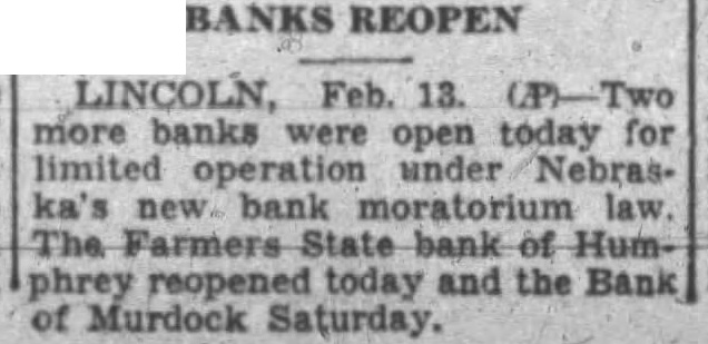 BANKS REOPEN LINCOLN, Feb. more open today limited operation under Nebrasbank moratorium law. Farmers bank Humreopened today and the Bank Murdock Saturday.