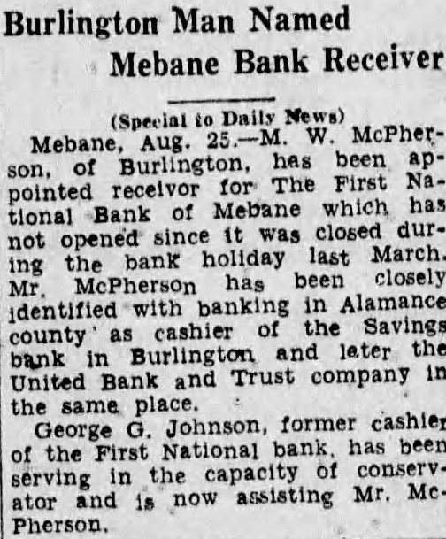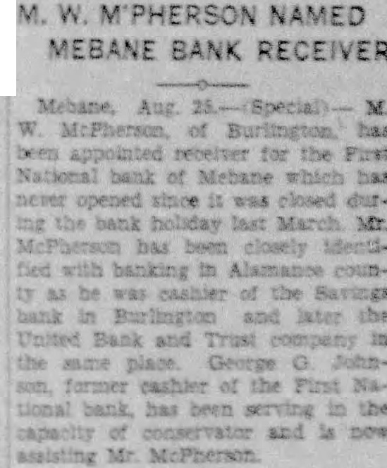 Burlington Man Named Mebane Bank Receiver Daily News) (Special McPherMebane, Aug. son, Burlington, First Nareceivor for pointed tional Bank of Mebane which has not opened last closed March. durbank holiday ing been closely has identified with banking in Alamance Savings cashier the county as and later the Burlington United bank Bank and Trust company in the same former cashier George Johnson, National bank has been the First capacity of conservserving in the Mr. Meand now assisting is Pherson.