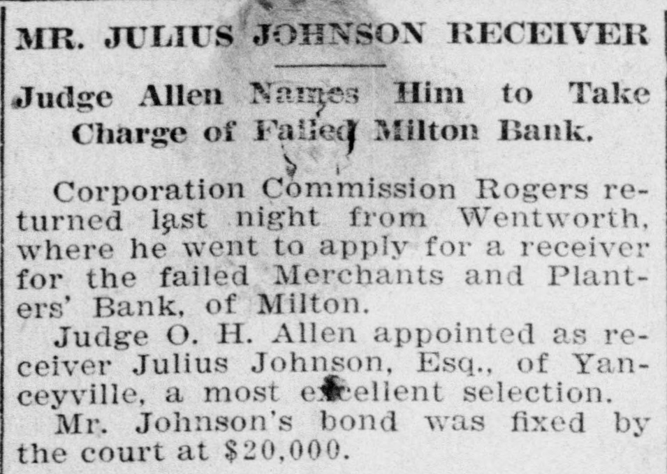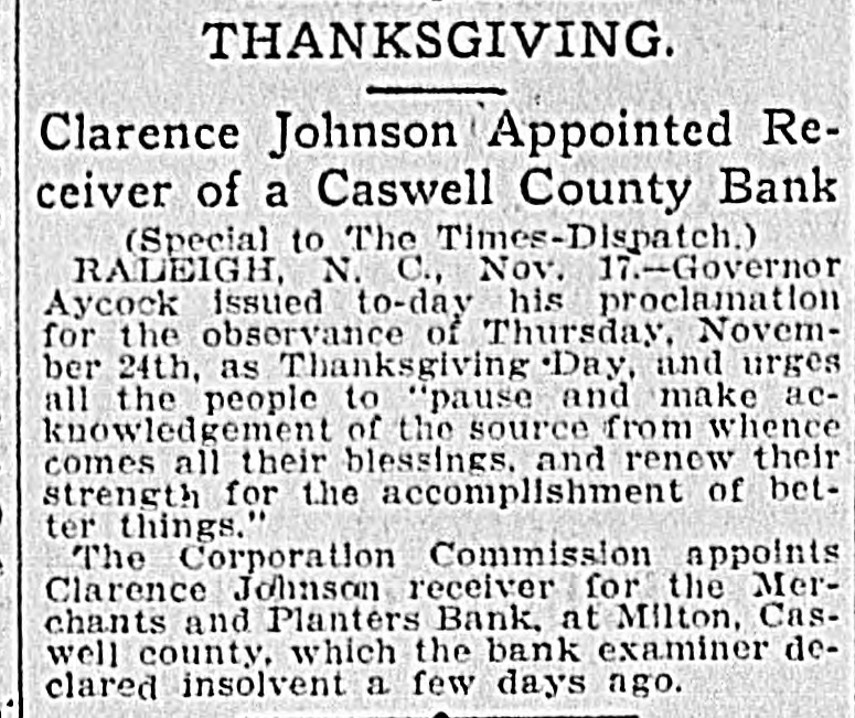 THANKSGIVING Clarence Johnson Appointed Receiver of a Caswell County Bank (Special to The Times-Dispatch.) RALEIGH, N. C., Nov. 17.-Governor Aycock issued to-day his proclamation for the observance of Thursday, November 24th, as Thanksgiving Day, and urges all the people to "pause and make acknowledgement of the source from whence comes all their blessings. and renew their strength for the accomplishment of better things." The Corporation Commission appoints Clarence Johnson receiver for the Merchants and Planters Bank, at Milton, Caswell county. which the bank examiner declared insolvent a few days ago.