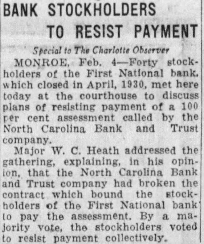 BANK STOCKHOLDERS TO RESIST PAYMENT Special The Charlotte Observer MONROE, Feb. 4-Forty stockholders of the First National bank. which closed in April, 1930, met here today at the courthouse to discuss plans of resisting payment of a 100 per cent assessment called by the North Carolina Bank and Trust Major W. C. Heath addressed the gathering, explaining, in his opinton, that the North Carolina Bank and Trust company had broken the contract which bound the stockholders of the First National bank to pay the assessment. By majority vote, the stockholders voted resist payment collectively.