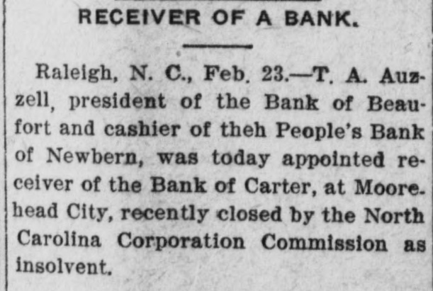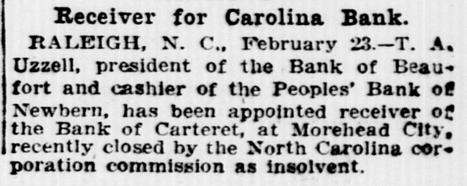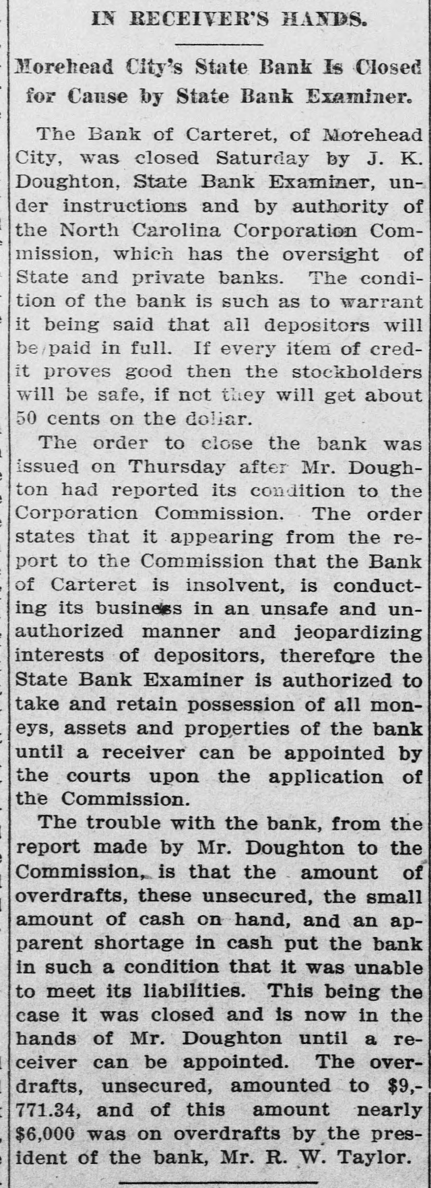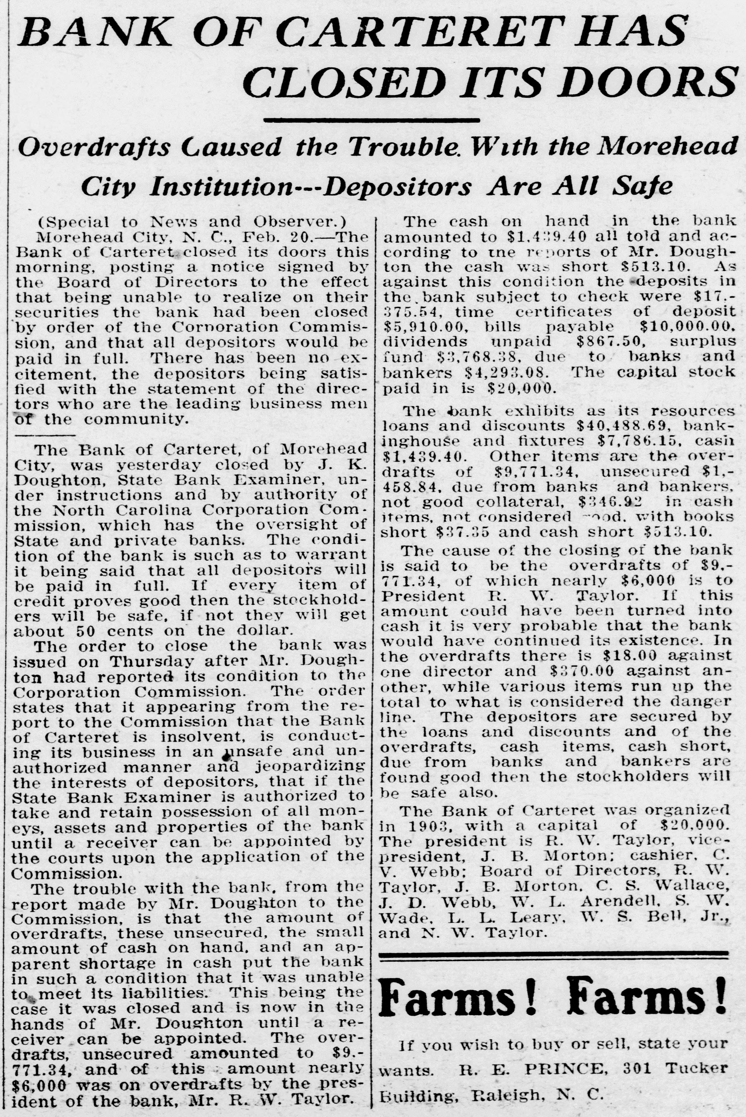 BANK OF CARTERET HAS CLOSED ITS DOORS Overdrafts Caused the Trouble. With the Morehead City Institution--Depositors Are All Safe The cash on hand in the bank (Special to News and Observer.) amounted to $1,439.40 all told and acMorehead City, N. C., Feb. 20.-The Bank of Carteret closed its doors this cording to the reports of Mr. Doughton the cash was short $513.10. As morning, posting a notice signed by the Board of Directors to the effect against this condition the deposits in the. bank subject to check were $17.that being unable to realize on their securities the bank had been closed 375.54, time certificates of deposit $5,910.00, bills payable $10,000.00. by order of the Cornoration Commisdividends unpaid $867.50, surplus sion, and that all depositors would be fund $3,768.38, due to banks and paid in full. There has been no exbankers $4,293.08. The capital stock citement, the depositors being satisfied with the statement of the direcpaid in is $20,000. tors who are the leading business men The bank exhibits as its resources of the community. loans and discounts $40,488.69, bankinghouse and fixtures $7,786.15, cash The Bank of Carteret, of Morehead $1,439.40. Other items are the overCity, was yesterday closed by J. K. drafts of $9,771.34, unsecured $1,Doughton, State Bank Examiner, un458.84, due from banks and bankers, der instructions and by authority of not good collateral, $346.92 in cash the North Carolina Corporation Comitems, not considered mood. with books mission, which has the oversight of short $37.35 and cash short $513.10. State and private banks. The condiThe cause of the closing of the bank tion of the bank is such as to warrant is said to be the overdrafts of $9.it being said that all depositors will 771.34, of which nearly $6,000 is to be paid in full. If every item of President R. W. Taylor. If this credit proves good then the stockholdamount could have been turned into ers will be safe, if not they will get cash it is very probable that the bank about 50 cents on the dollar. would have continued its existence. In The order to close the bank was the overdrafts there is $18.00 against issued on Thursday after Mr. Doughone director and $370.00 against anton had reported its condition to the other, while various items run up the Corporation Commission. The order total to what is considered the danger states that it appearing from the reline. The depositors are secured by port to the Commission that the Bank the loans and discounts and of the of Carteret is insolvent, is conductoverdrafts, cash items, cash short, ing its business in an unsafe and undue from banks and bankers are authorized manner and jeopardizing found good then the stockholders will the interests of depositors, that if the be safe also. State Bank Examiner is authorized to The Bank of Carteret was organized take and retain possession of all monin 1903, with a capital of $20,000. eys, assets and properties of the bank until a receiver can be appointed by The president is R. W. Taylor, vicepresident, J. B. Morton; cashier, C. the courts upon the application of the V. Webb: Board of Directors, R. W. Commission. The trouble with the bank. from the Taylor, J. B. Morton. C. S. Wallace, J. D. Webb, W. L. Arendell, S. W. report made by Mr. Doughton to the Wade. L. L. Leary, W. S. Bell, Jr., Commission, is that the amount of and N. W. Taylor. overdrafts, these unsecured, the small amount of cash on hand, and an apparent shortage in cash put the bank in such a condition that it was unable to meet its liabilities. This being the case it was closed and is now in the Farms! Farms! hands of Mr. Doughton until a receiver can be appointed. The overIf you wish to buy or sell, state your drafts, unsecured amounted to $9.wants. R. E. PRINCE, 301 Tucker 771.34, and of this amount nearly $6,000 was on overdrafts by the presBuilding, Raleigh, N. C. ident of the bank, Mr. R. W. Taylor.