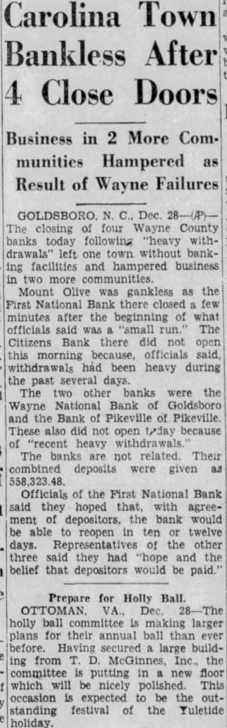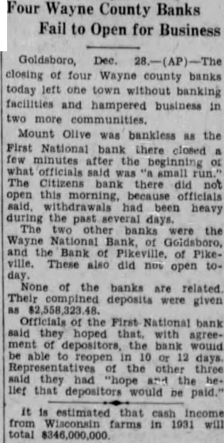 Four Wayne County Banks Close Doors ONE TOWN LEFT WITHOUT A BANK Withdrawals Make Step Necessary For Conserving of Assets Goldsboro, Dec. closing of four Wayne county banks today following "heavy withdrawals" and small run left one town without banking facilities and hampered business in two more communities. Mount Olive was bankless the First National Bank there closed few minutes after the beginning what officials said was "small run.' The Citizens Bank there did not open this merning because, sahl, withdrawals had been heavy the past several days. The two other banks were the Wayne National Bank of the Bank of Pikeville of Pikeville. These also did not open today because of heavy withdrawals." None of the banks are related. Their combined deposits were given of the First National Bank said they hoped that, with of opositors, the bank would be to in 10 days. Representatives of the other three they had "hope and the belief that depositors be paid. The Wayne National Bank the largest in Enstern North Carolina. is voted to and Stroud, cause heavy bank listed Bordan president and Resources by the Wayne tional Bank in last statement cluded its banking house and fix The Branch Banking and Trast Company, only remaining commer cial bank in Goldsboro, had sende withdrawals today but these were ceeded deposits by the -0m $6,400 which regarded very good showing considering the unrest caused by the Wayne National clos inc. Deposits at the Branch Bank dightly under $75,000. "Goldsboro on the financial may, declared B. G. Thompson, prominent merchant and business man here. The bank Pisevile was capitalized at $20,000 and had surplus of $5,000; the Bank capitalized at $50,000 and and plus of $50,000; the Wayne Bank was capitalized at $$50,000 and had surplus of $100,000 Statements of the First National Bank gave its resources as $379, 988.17 with surplus and capital $50,000 each. Thigpen is its president. H. Cox is president of the Cit izens Bank. A notice was posted on the door of this bank and the Bank of Pikeville but th Wayne National Bank had issued no official statement. The Bank of Walstonburg in Greene county failed to open yester day but gave notice to its depositors to come and get their money the bank was going out of business It understood that the bank was not profitable and that the manage ment decided it the part of wisdom to close up shop. Carl T. Hicks cashier. The State of North Carolina had on deposit in the Wayne National bank secured by $50,000 in bonds; $4,500 in the Citizens Bank Mount Olive secured by $5,000 bonds, and $4,300 on deposit Olive in of Mt. seFirst National the cured by $5,000 in bonds. Tuesday morning, Gurney P. Hood, State Commissioner of Banks, was informed Monday night at meeting of the board of directors. The bank had capital and surplus of $26,000 and deposits of more than $100,000. Hugh Womble was presiand W. Goldston, eashier.