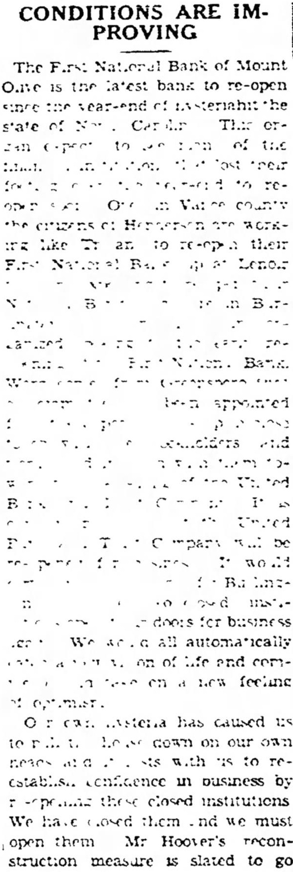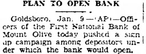 The First National Bank of Mount Olive is the latest bank to re-open since ...; plan to open bank ... Jan. 9 reported campaign to open the bank; Jan. 19 notes conditions improving and re-opened status noted.