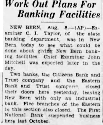 NEW BERN, Aug. Examiner Taylor, of the state banking department, was in New Bern today to see what could be done about giving New Bern banking facilities. Chief Examiner John Mitchell was expected later in the day. Two banks, the Citizens Bank and Trust company and the Eastern Bank and Trust company, closed their doors here yesterday, leaving New Bern with only an industrial bank. Five branches of the Eastern in this section also closed. The First National Bank suspended business here last October.