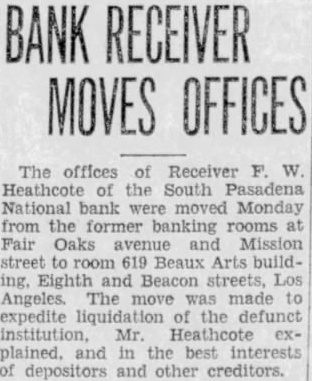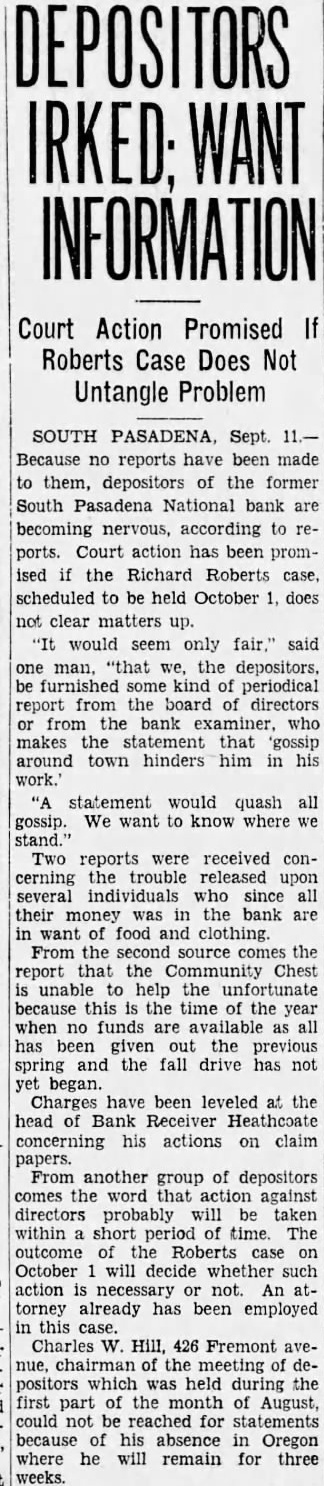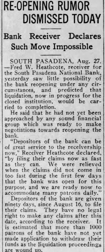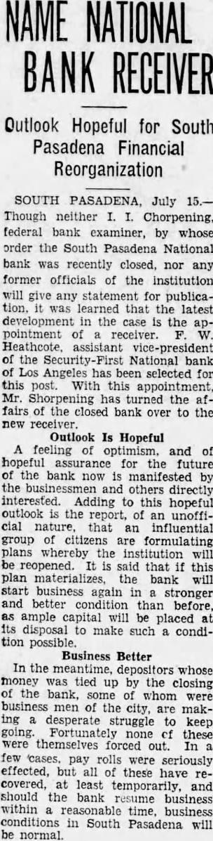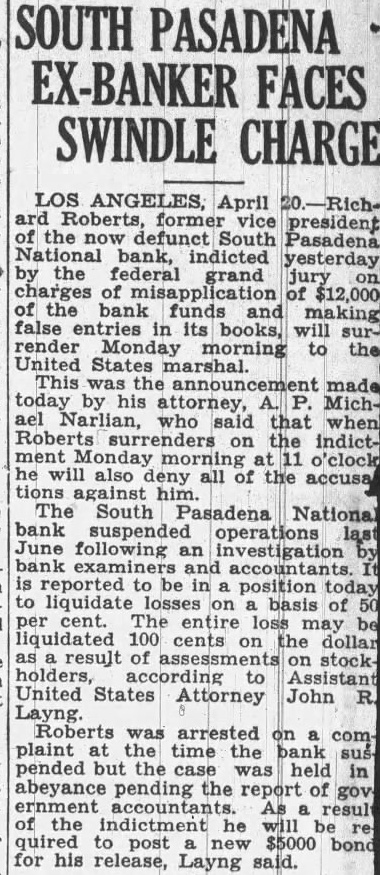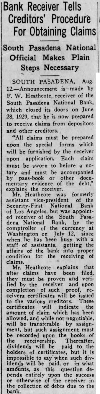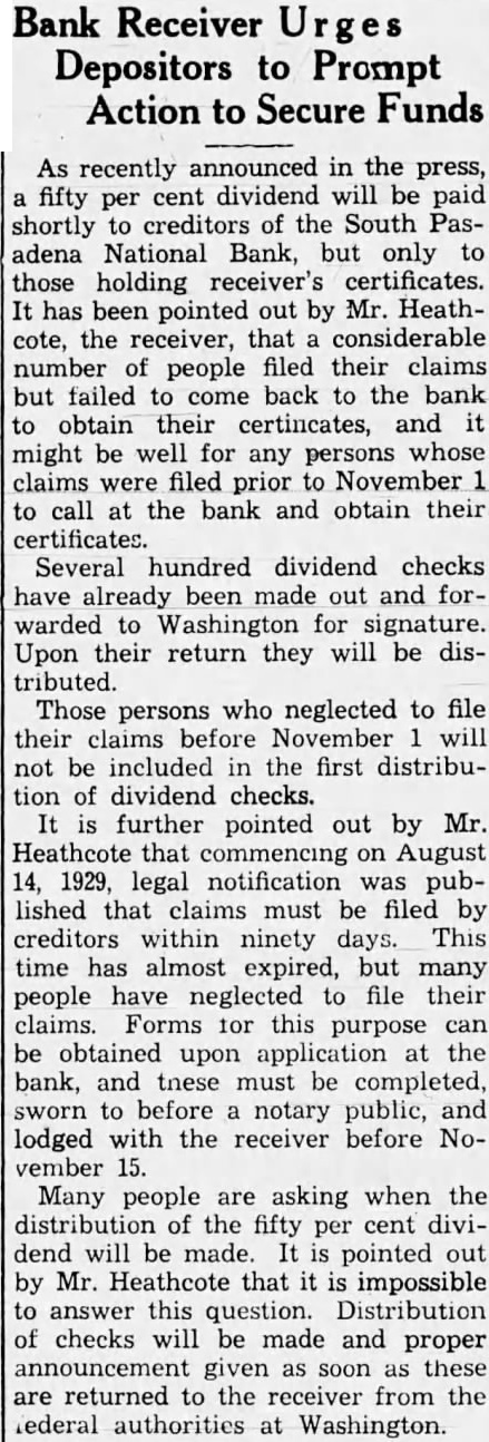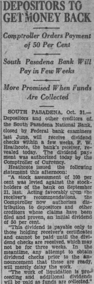 BANK ASSETS TOLD SOUTH PASADENA, April 7. Total assets of the former South Pasadena National bank now amount to $338,559.42 according to the announcement of F. W. Heathcote, federal receiver. Total liabilities amount to $417,760.73. The figures represent sums accounted for on March 31 of this year. Listed under the heading of assets, $229,764.96 are for bills receivable. $16,115.78 for other than bills receivable, $36,541.85 for stock $10,030.84 for additional assets acquired, $292,453.43 for total uncollected assets, $46,105.99 for cash on hand. Under liabilities, $386,279.56 are for total unsecured claims proved. for total unsecured claims not proved, total rediscounts unpaid, total secured claims unpaid, and total bills payable unpaid are not listed while total additional claims proved amounted to $15,Dividend paid during the last quarter, to March 31, amounted to $36,138.50. and total dividend paid to date amounted to $200,786.67 In his comments upon the condition of the former bank, Receiver Heathcote said, "I am sorry that it is not possible for me to give any indication at this time, as to when or in what an other dividend will be paid. Up to this time, there has been but one dividend of 50 per cent. and most of this already has been paid out. While the cash on hand, as shown in the statement, might indicate the posibility of another early dividend, considerable pending litigation makes it essential that a sufficient cash reserves shall be maintained to cover possible emergencies.