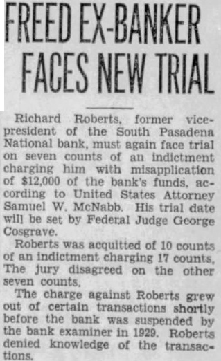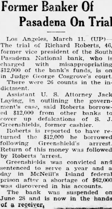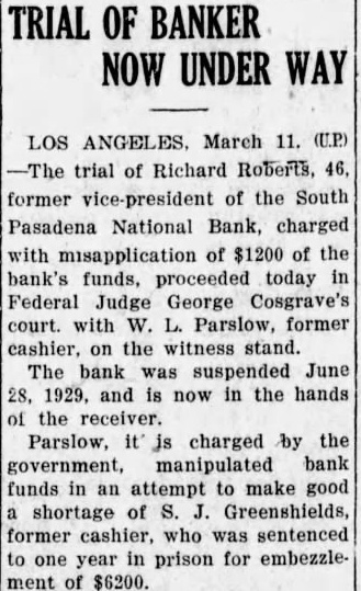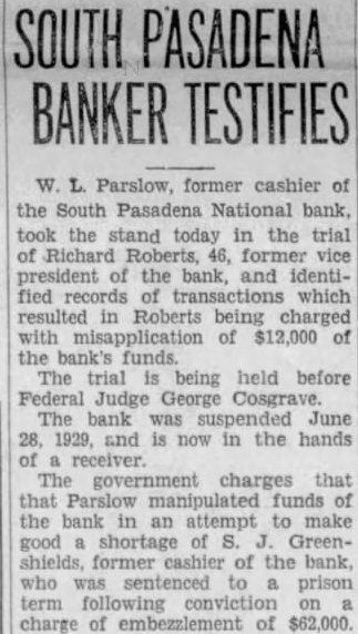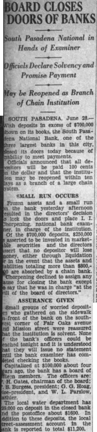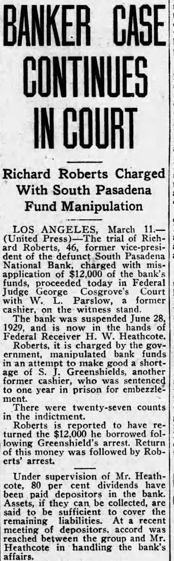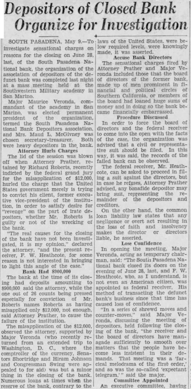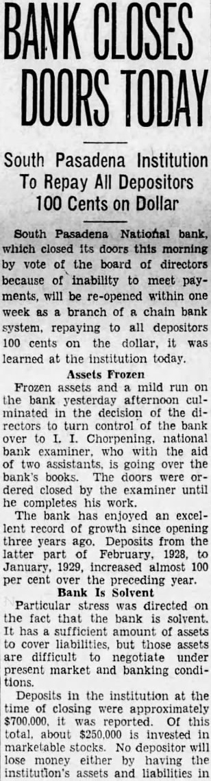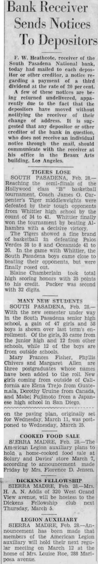 BANK ASSETS TOLD SOUTH PASADENA, April 7. Total assets of the former South Pasadena National bank now amount to $338,559.42 according to the announcement of F. W. Heathcote, federal receiver. Total liabilities amount to $417,760.73. The figures represent sums accounted for on March 31 of this year. Listed under the heading of assets, $229,764.96 are for bills receivable. $16,115.78 for other than bills receivable, $36,541.85 for stock $10,030.84 for additional assets acquired, $292,453.43 for total uncollected assets, $46,105.99 for cash on hand. Under liabilities, $386,279.56 are for total unsecured claims proved. for total unsecured claims not proved, total rediscounts unpaid, total secured claims unpaid, and total bills payable unpaid are not listed while total additional claims proved amounted to $15,Dividend paid during the last quarter, to March 31, amounted to $36,138.50. and total dividend paid to date amounted to $200,786.67 In his comments upon the condition of the former bank, Receiver Heathcote said, "I am sorry that it is not possible for me to give any indication at this time, as to when or in what an other dividend will be paid. Up to this time, there has been but one dividend of 50 per cent. and most of this already has been paid out. While the cash on hand, as shown in the statement, might indicate the posibility of another early dividend, considerable pending litigation makes it essential that a sufficient cash reserves shall be maintained to cover possible emergencies.