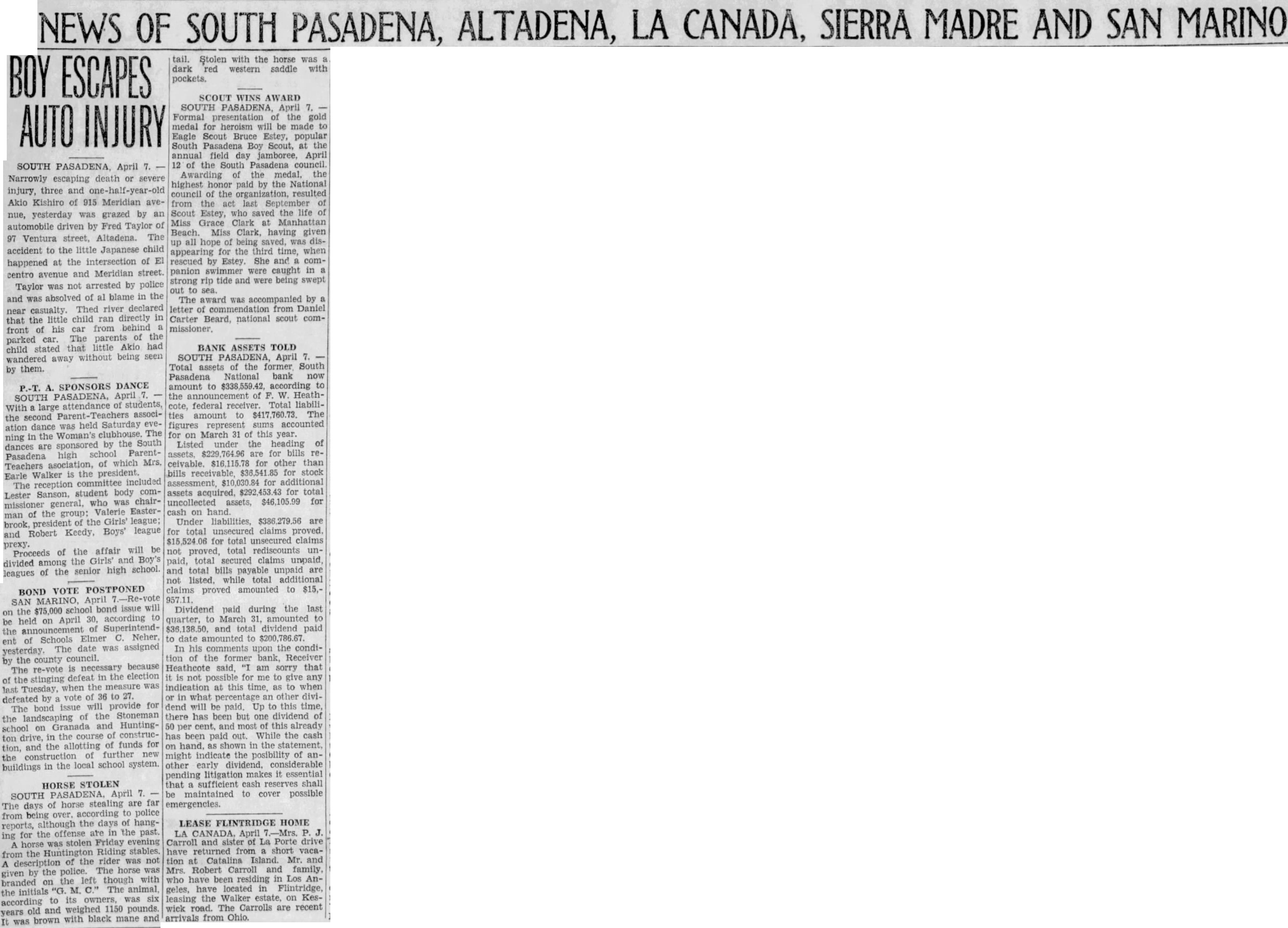 SCOUT WINS AWARD SOUTH PASADENA, April 7. Formal presentation of the gold medal for heroism will be made to Eagle Scout Bruce Estey, popular South Pasadena Boy Scout, at the annual field day jamboree, April 12 of the South Pasadena council Awarding of the medal, the highest honor paid by the National council of the organization, resulted from the act last September of Scout Estey, who saved the life of Miss Grace Clark at Manhattan Beach. Miss Clark, having given up all hope of being saved, was disappearing for the third time, when rescued by Estey. She and a companion swimmer were caught in strong rip tide and were being swept out to sea. The award was accompanied by a letter of commendation from Daniel Carter Beard, national scout commissioner.