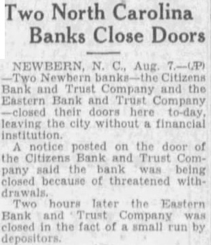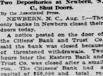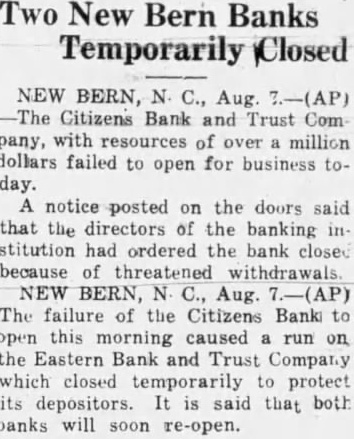 A notice posted on the doors said that the directors of the banking in stitution had ordered the bank closed because of threatened withdrawals. NEW BERN, N C., Aug. The failure of the Citizens Bank to open this morning caused run on the Eastern Bank and Trust Company which closed temporarily to protect its depositors. It is said that both banks will soon re-open.