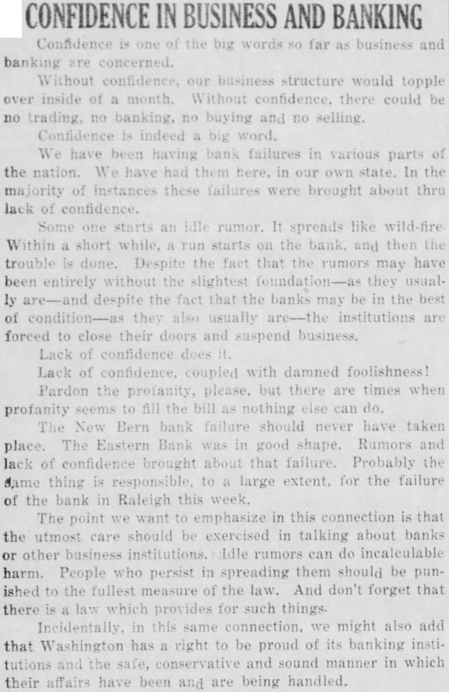 Confidence is one of the big words so far as business and banking are concerned. Without confidence, our business structure would topple over inside of a month. Without confidence, there could be no trading, no banking, no buying and no selling. Confidence is indeed a big word. We have been having bank failures in various parts of the nation. We have had them here, in our own state. In the majority of instances these failures were brought about thru lack of confidence. Some one starts an idle rumor. It spreads like wild-fire Within a short while, a run starts on the bank, and then the trouble is done. Despite the fact that the rumors may have been entirely without the slightest foundation-as they usually are-and despite the fact that the banks may be in the best of condition-as they also usually are-the institutions are forced to close their doors and suspend business. Lack of confidence does it. Lack of confidence, coupled with damned foolishness! Pardon the profanity, please, but there are times when profanity seems to fill the bill as nothing else can do. The New Bern bank failure should never have taken place. The Eastern Bank was in good shape. Rumors and lack of confidence brought about that failure. Probably the same thing is responsible, to a large extent. for the failure of the bank in Raleigh this week. The point we want to emphasize in this connection is that the utmost care should be exercised in talking about banks or other business institutions. Idle rumors can do incalculable harm. People who persist in spreading them should be punished to the fullest measure of the law. And don't forget that there is a law which provides for such things. Incidentally, in this same connection. we might also add that Washington has a right to be proud of its banking institutions and the safe, conservative and sound manner in which their affairs have been and are being handled.