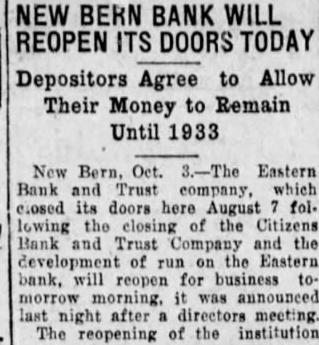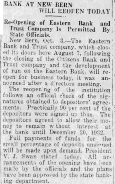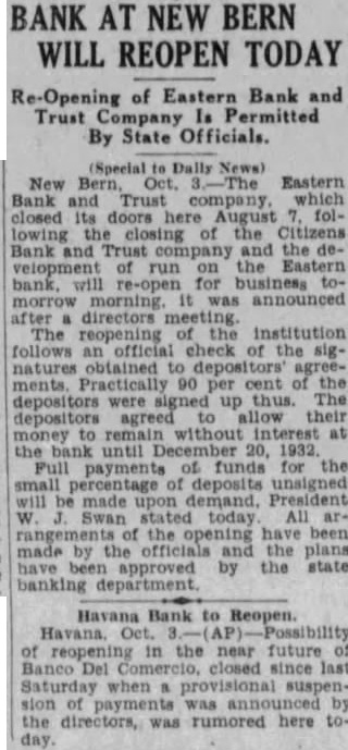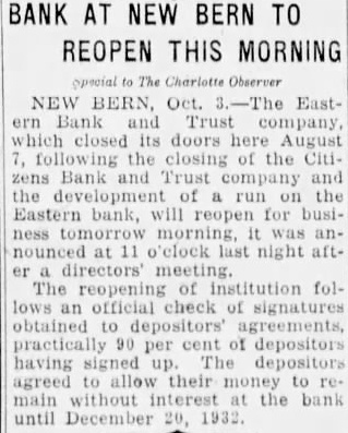 The Charlotte Observer NEW BERN, Oct. 3.-The Eastern Bank and Trust company, which closed its doors here August following the closing of the Citizens Bank and Trust company and the development of run on the Eastern bank, will reopen for busitomorrow morning, it was nounced at 11 o'clock last night after a directors' meeting. The reopening of institution follows an official check of signatures obtained to depositors agreements, practically 90 per cent of depositors having signed up. The depositors agreed to allow their money to rewithout interest at the bank until December 20, 1932.
