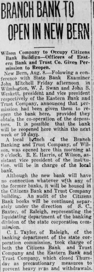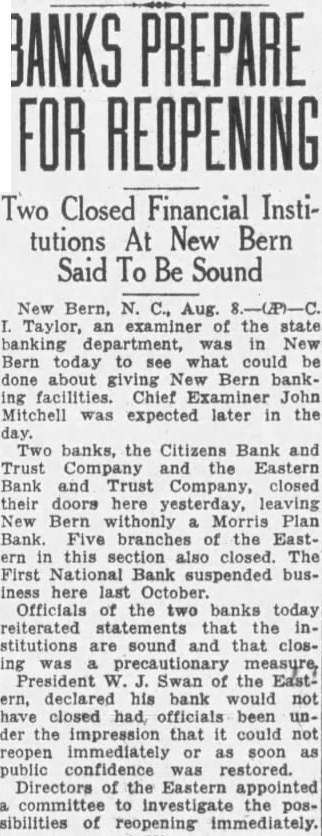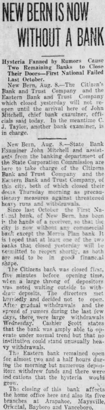 New Bern, Aug. Bank Examiner John Mitchell assistfrom the banking department of the State Corporation Commission are here take charge of the Citizens Bank Trust Company the Bank and Trust Company, this both which closed their docis Thursday morning precautionary measures against and Since last October the First New has the hands that city bank except the Plan bank oped that one the banks yesterday are said to be good financial shape. Citizens bank closed five minutes before opening time, large throng depositors was noted waiting outside withdeposits. directors met decided After gradual withdrawals and the spread rumors during the last there large withdrawals Wednesday. Cashier Scott states that the bank was amply able to erate under normal trend but that institution could stand unusually Eastern bank remained open for almost two and half hours during the morning but depositors withdrew funds and there ind cations that the hysteria would grow. closing of this bank affects the home here its five branches Arapahoe, Maysville, Oriental, Bayboro and Vanceboro.