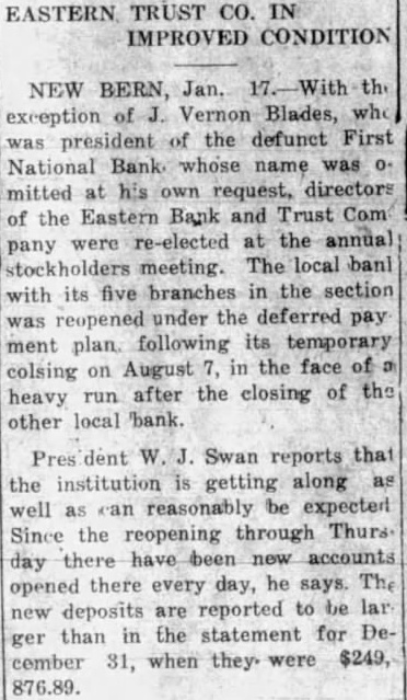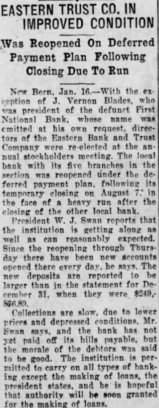 New Bern. Jan. the Vernon Blades, president of the defunct First National whose cmitted his request. directhe Eastern and Trust Company meeting. The local with its five branches the section reopened under ferred payment following temporary August face heavy after closing the local Swan the institution getting along can expected. through Thurs day every deposits reported larger than the statement for cember 31. when they were $249,Collections are due to lower and Mr the bank has not paid bills morale the debtors was said good. The institution mitted types except the making loans, states, and hopeful authority will be soon granted the making loans.