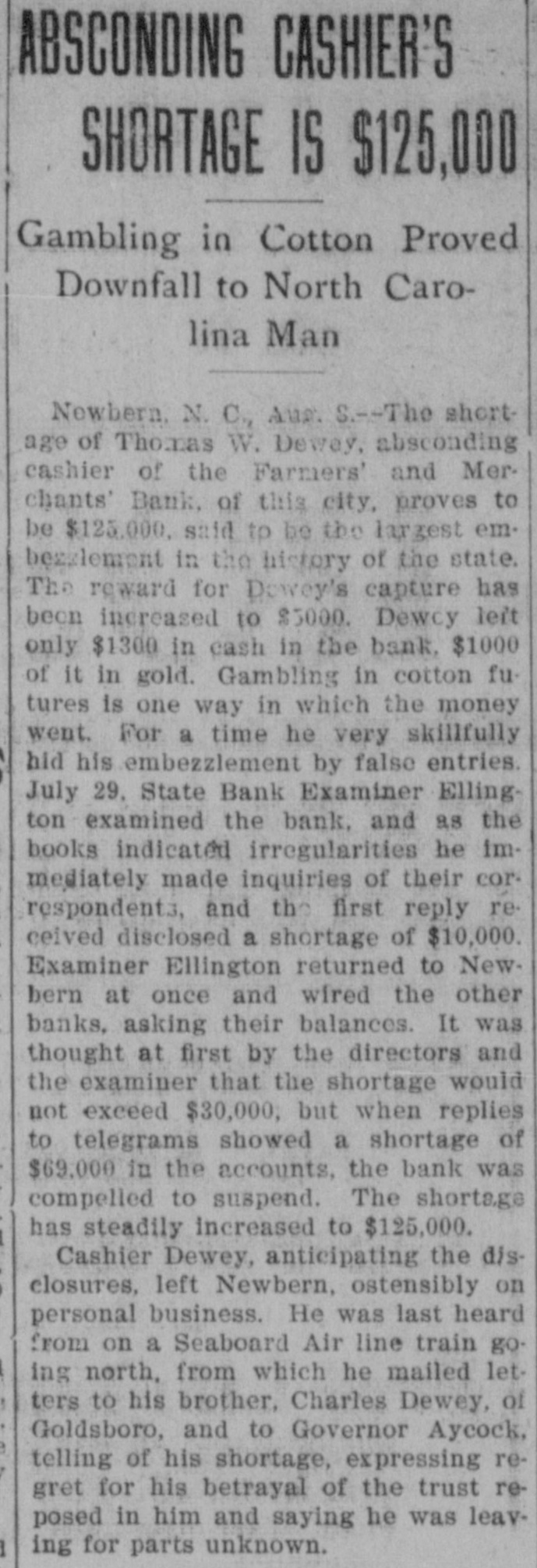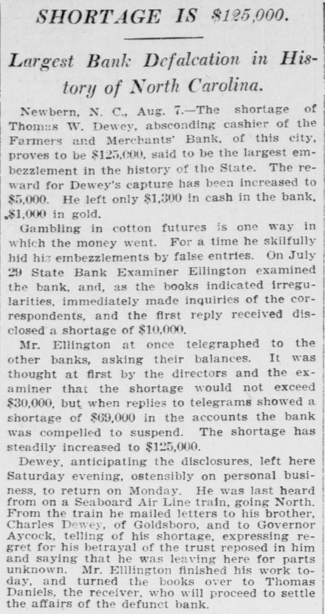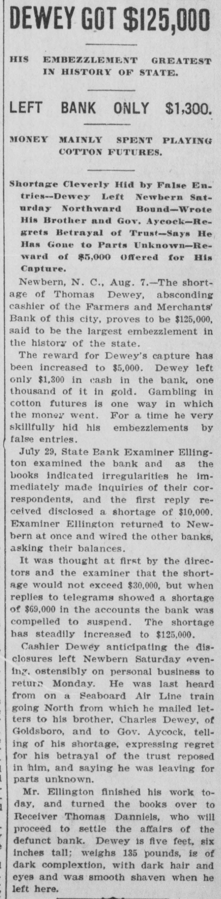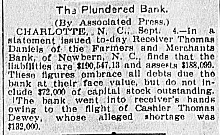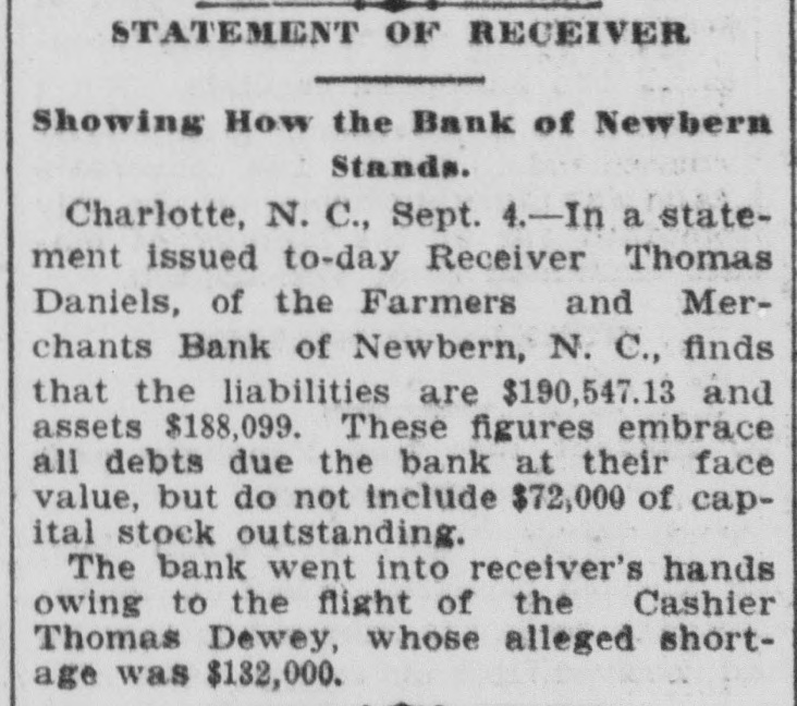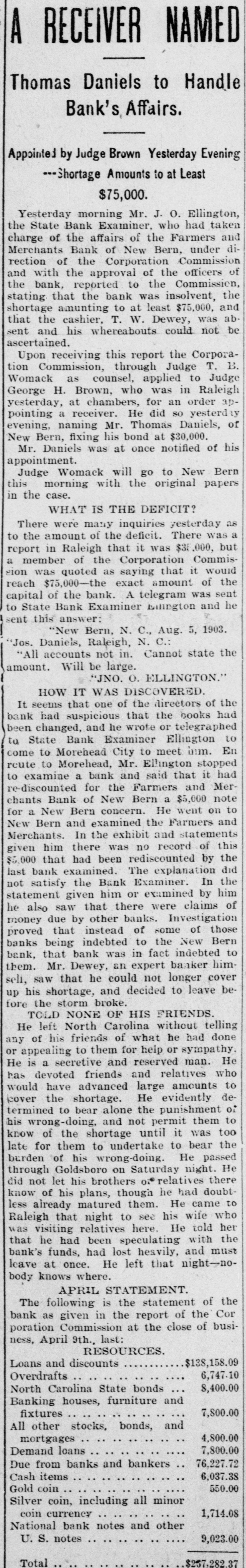A RECEIVER NAMED Thomas Daniels to Handle Bank's Affairs. Appointed by Judge Brown Yesterday Evening ---Shortage Amounts to at Least $75,000. Yesterday morning Mr. J. O. Ellington, the State Bank Examiner, who had taken charge of the affairs of the Farmers and Merchants Bank of New Bern, under direction of the Corporation Commission and with the approval of the officers of the bank, reported to the Commission, stating that the bank was insolvent, the shortage amunting to at least $75,000, and that the cashier, T. W. Dewey, was ab. sent and his whereabouts could not be ascertained. Upon receiving this report the Corporation Commission, through Judge T. B. Womack as counsel, applied to Judge George H. Brown, who was in Raleigh yesterday, at chambers, for an order appointing a receiver. He did so yesterd ly evening, naming Mr. Thomas Daniels, of New Bern, fixing his bond at $30,000. Mr. Daniels was at once notified of his appointment. Judge Womack will go to New Bern this morning with the original papers in the case. WHAT IS THE DEFICIT? There were many inquiries yesterday as to the amount of the deficit. There was a report in Raleigh that it was $35 .000, but a member of the Corporation Commission was quoted as saying that it would reach $75,000-the exact amount of the capital of the bank. A telegram was sent to State Bank Examiner Eilington and he sent this answer: "New Bern, N. C., Aug. 5, 1903. "Jos. Daniels, Raleigh, N. C.: "All accounts not in. Cannot state the amount. Will be large. "JNO. O. ELLINGTON." HOW IT WAS DISCOVERED. It seems that one of the directors of the bank had suspicious that the books had been changed, and he wrote or telegraphed to State Bank Examiner Ellington to come to Morehead City to meet inm. En rcute to Morehead, Mr. Ellington stopped to examine a bank and said that it had re-discounted for the Farmers and Merchants Bank of New Bern a $5,000 note for a New Bern concern. He went on to New Bern and examined the Farmers and Merchants. In the exhibit and statements given him there was no record of this $5,000 that had been rediscounted by the last bank examined. The explanation did not satisfy the Bank Examiner. In the statement given him or examined by him he also saw that there were claims of money due by other banks. Investigation proved that instead of some of those banks being indebted to the New Bern bank, that bank was in fact indebted to them. Mr. Dewey, an expert banker himseli, saw that he could not longer cover up his shortage, and decided to leave before the storm broke. TOLD NONE OF HIS FRIENDS. He left North Carolina without telling any of his friends of what he had done or appealing to them for help or sympathy. He is a secretive and reserved man. He has devoted friends and relatives who would have advanced large amounts to cover the shortage. He evidently determined to bear alone the punishment of his wrong-doing, and not permit them to know of the shortage until it was too late for them to undertake to bear the burden of his wrong-doing. He passed through Goldsboro on Saturday night. He did not let his brothers 0,* relatives there know of his plans, though he had doubtless already matured them. He came to Raleigh that night to see his wife who was visiting relatives here. He told her that he had been speculating with the bank's funds, had lost heavily, and must leave at once. He left that night-nobody knows where. APRIL STATEMENT. The following is the statement of the bank as given in the report of the Cor poration Commission at the close of business, April 9th., last: RESOURCES. Loans and discounts $138,158.09 6,747.10 Overdrafts North Carolina State bonds 8,400.00 Banking houses, furniture and fixtures 7,800.00 All other stocks, bonds, and 4,800.00 mortgages 7,800.00 Demand loans Due from banks and bankers 76,227.72 6,037.38 Cash items 550.00 Gold coin Silver coin, including all minor coin currency 1,714.08 National bank notes and other U.S.notes 9,023.00 Total