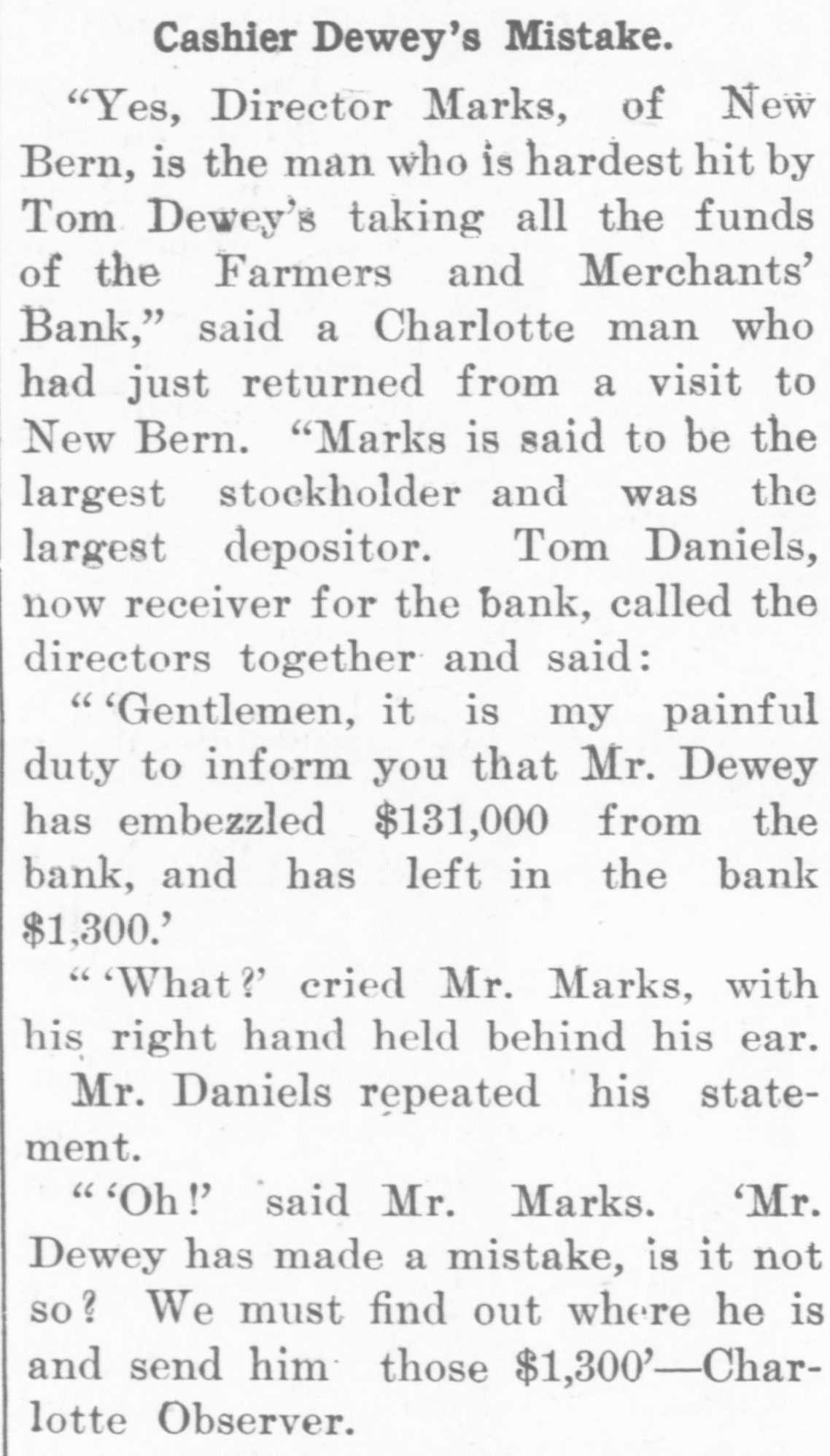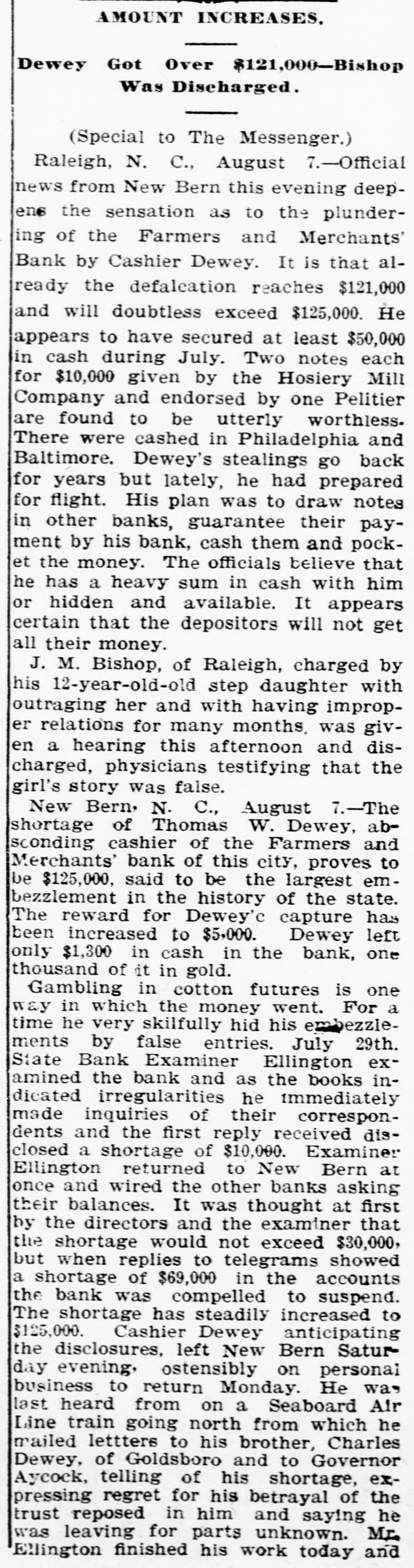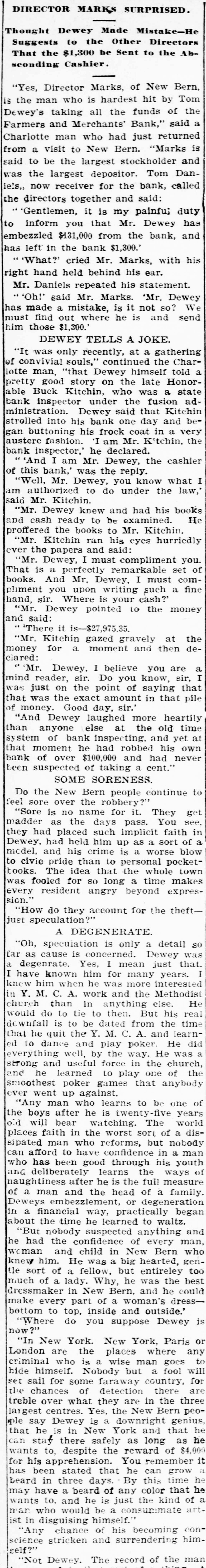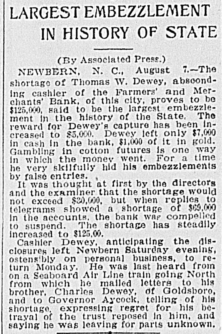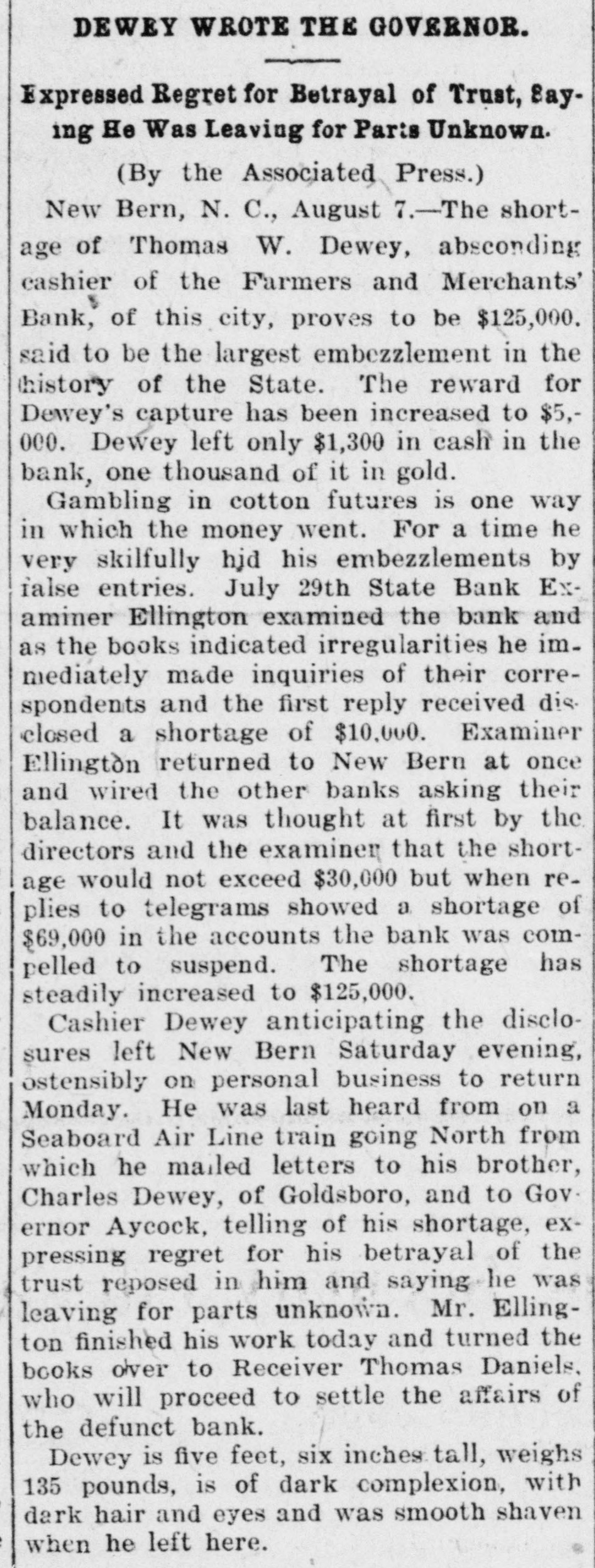A RECEIVER NAMED Thomas Daniels to Handle Bank's Affairs. Appointed by Judge Brown Yesterday Evening ---Shortage Amounts to at Least $75,000. Yesterday morning Mr. J. O. Ellington, the State Bank Examiner, who had taken charge of the affairs of the Farmers and Merchants Bank of New Bern, under direction of the Corporation Commission and with the approval of the officers of the bank, reported to the Commission, stating that the bank was insolvent, the shortage amunting to at least $75,000, and that the cashier, T. W. Dewey, was ab. sent and his whereabouts could not be ascertained. Upon receiving this report the Corporation Commission, through Judge T. B. Womack as counsel, applied to Judge George H. Brown, who was in Raleigh yesterday, at chambers, for an order appointing a receiver. He did so yesterd ly evening, naming Mr. Thomas Daniels, of New Bern, fixing his bond at $30,000. Mr. Daniels was at once notified of his appointment. Judge Womack will go to New Bern this morning with the original papers in the case. WHAT IS THE DEFICIT? There were many inquiries yesterday as to the amount of the deficit. There was a report in Raleigh that it was $35 .000, but a member of the Corporation Commission was quoted as saying that it would reach $75,000-the exact amount of the capital of the bank. A telegram was sent to State Bank Examiner Eilington and he sent this answer: "New Bern, N. C., Aug. 5, 1903. "Jos. Daniels, Raleigh, N. C.: "All accounts not in. Cannot state the amount. Will be large. "JNO. O. ELLINGTON." HOW IT WAS DISCOVERED. It seems that one of the directors of the bank had suspicious that the books had been changed, and he wrote or telegraphed to State Bank Examiner Ellington to come to Morehead City to meet inm. En rcute to Morehead, Mr. Ellington stopped to examine a bank and said that it had re-discounted for the Farmers and Merchants Bank of New Bern a $5,000 note for a New Bern concern. He went on to New Bern and examined the Farmers and Merchants. In the exhibit and statements given him there was no record of this $5,000 that had been rediscounted by the last bank examined. The explanation did not satisfy the Bank Examiner. In the statement given him or examined by him he also saw that there were claims of money due by other banks. Investigation proved that instead of some of those banks being indebted to the New Bern bank, that bank was in fact indebted to them. Mr. Dewey, an expert banker himseli, saw that he could not longer cover up his shortage, and decided to leave before the storm broke. TOLD NONE OF HIS FRIENDS. He left North Carolina without telling any of his friends of what he had done or appealing to them for help or sympathy. He is a secretive and reserved man. He has devoted friends and relatives who would have advanced large amounts to cover the shortage. He evidently determined to bear alone the punishment of his wrong-doing, and not permit them to know of the shortage until it was too late for them to undertake to bear the burden of his wrong-doing. He passed through Goldsboro on Saturday night. He did not let his brothers 0,* relatives there know of his plans, though he had doubtless already matured them. He came to Raleigh that night to see his wife who was visiting relatives here. He told her that he had been speculating with the bank's funds, had lost heavily, and must leave at once. He left that night-nobody knows where. APRIL STATEMENT. The following is the statement of the bank as given in the report of the Cor poration Commission at the close of business, April 9th., last: RESOURCES. Loans and discounts $138,158.09 6,747.10 Overdrafts North Carolina State bonds 8,400.00 Banking houses, furniture and fixtures 7,800.00 All other stocks, bonds, and 4,800.00 mortgages 7,800.00 Demand loans Due from banks and bankers 76,227.72 6,037.38 Cash items 550.00 Gold coin Silver coin, including all minor coin currency 1,714.08 National bank notes and other U.S.notes 9,023.00 Total
