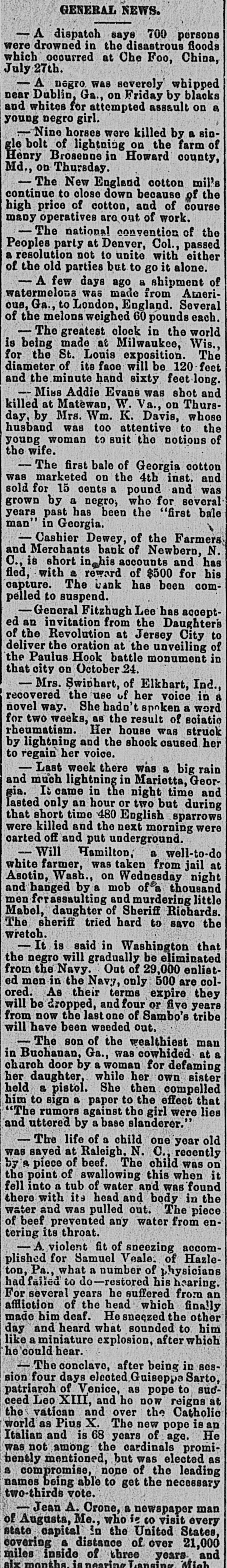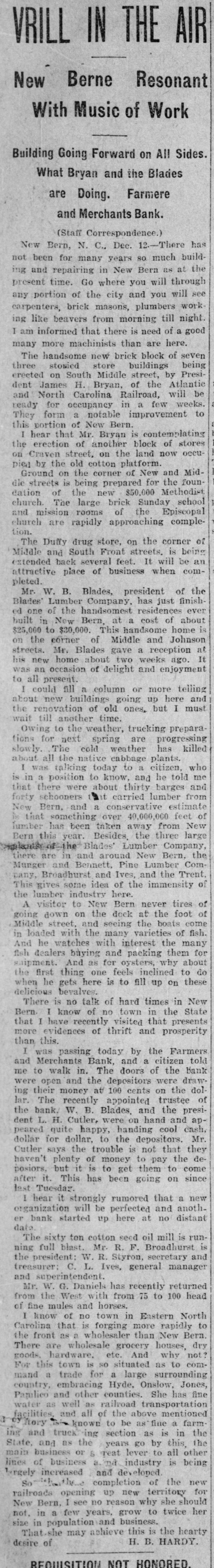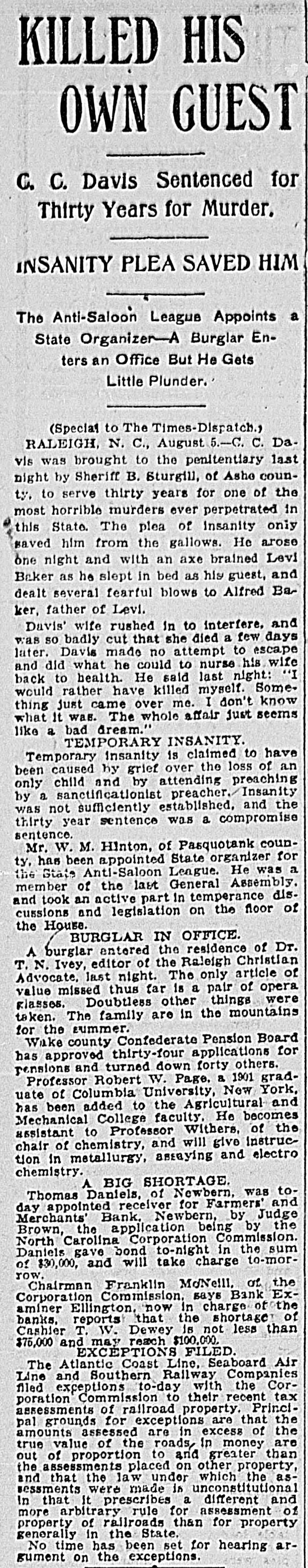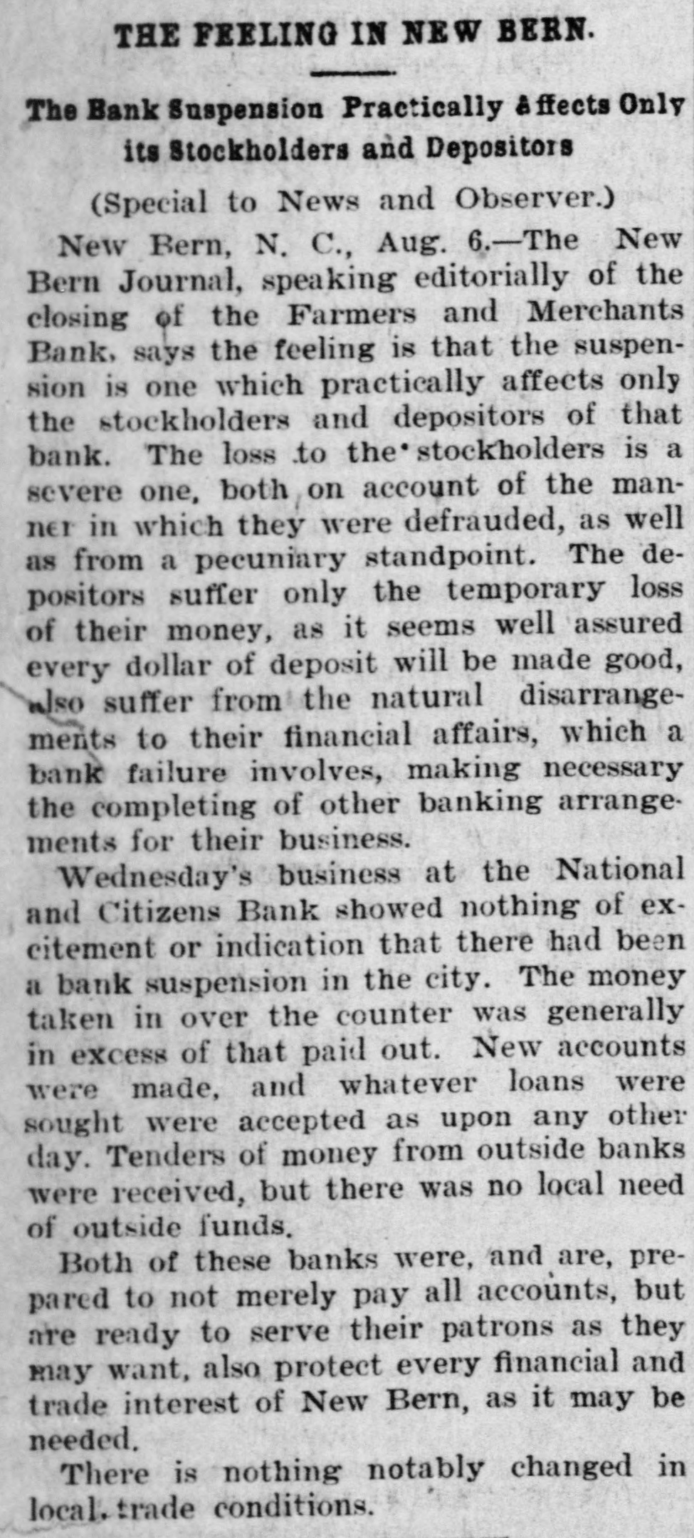 A RECEIVER NAMED Thomas Daniels to Handle Bank's Affairs. Appointed by Judge Brown Yesterday Evening ---Shortage Amounts to at Least $75,000. Yesterday morning Mr. J. O. Ellington, the State Bank Examiner, who had taken charge of the affairs of the Farmers and Merchants Bank of New Bern, under direction of the Corporation Commission and with the approval of the officers of the bank, reported to the Commission, stating that the bank was insolvent, the shortage amunting to at least $75,000, and that the cashier, T. W. Dewey, was ab. sent and his whereabouts could not be ascertained. Upon receiving this report the Corporation Commission, through Judge T. B. Womack as counsel, applied to Judge George H. Brown, who was in Raleigh yesterday, at chambers, for an order appointing a receiver. He did so yesterd ly evening, naming Mr. Thomas Daniels, of New Bern, fixing his bond at $30,000. Mr. Daniels was at once notified of his appointment. Judge Womack will go to New Bern this morning with the original papers in the case. WHAT IS THE DEFICIT? There were many inquiries yesterday as to the amount of the deficit. There was a report in Raleigh that it was $35 .000, but a member of the Corporation Commission was quoted as saying that it would reach $75,000-the exact amount of the capital of the bank. A telegram was sent to State Bank Examiner Eilington and he sent this answer: "New Bern, N. C., Aug. 5, 1903. "Jos. Daniels, Raleigh, N. C.: "All accounts not in. Cannot state the amount. Will be large. "JNO. O. ELLINGTON." HOW IT WAS DISCOVERED. It seems that one of the directors of the bank had suspicious that the books had been changed, and he wrote or telegraphed to State Bank Examiner Ellington to come to Morehead City to meet inm. En rcute to Morehead, Mr. Ellington stopped to examine a bank and said that it had re-discounted for the Farmers and Merchants Bank of New Bern a $5,000 note for a New Bern concern. He went on to New Bern and examined the Farmers and Merchants. In the exhibit and statements given him there was no record of this $5,000 that had been rediscounted by the last bank examined. The explanation did not satisfy the Bank Examiner. In the statement given him or examined by him he also saw that there were claims of money due by other banks. Investigation proved that instead of some of those banks being indebted to the New Bern bank, that bank was in fact indebted to them. Mr. Dewey, an expert banker himseli, saw that he could not longer cover up his shortage, and decided to leave before the storm broke. TOLD NONE OF HIS FRIENDS. He left North Carolina without telling any of his friends of what he had done or appealing to them for help or sympathy. He is a secretive and reserved man. He has devoted friends and relatives who would have advanced large amounts to cover the shortage. He evidently determined to bear alone the punishment of his wrong-doing, and not permit them to know of the shortage until it was too late for them to undertake to bear the burden of his wrong-doing. He passed through Goldsboro on Saturday night. He did not let his brothers 0,* relatives there know of his plans, though he had doubtless already matured them. He came to Raleigh that night to see his wife who was visiting relatives here. He told her that he had been speculating with the bank's funds, had lost heavily, and must leave at once. He left that night-nobody knows where. APRIL STATEMENT. The following is the statement of the bank as given in the report of the Cor poration Commission at the close of business, April 9th., last: RESOURCES. Loans and discounts $138,158.09 6,747.10 Overdrafts North Carolina State bonds 8,400.00 Banking houses, furniture and fixtures 7,800.00 All other stocks, bonds, and 4,800.00 mortgages 7,800.00 Demand loans Due from banks and bankers 76,227.72 6,037.38 Cash items 550.00 Gold coin Silver coin, including all minor coin currency 1,714.08 National bank notes and other U.S.notes 9,023.00 Total