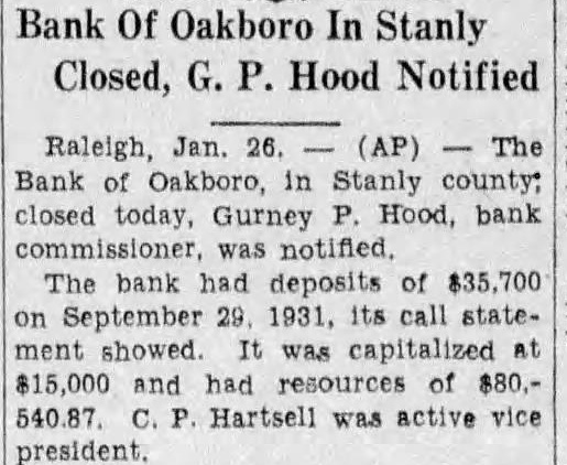 Bank Of Oakboro In Stanly Closed, G. P. Hood Notified Raleigh, Jan. 26. (AP) The Bank in Stanly county; closed today, Gurney P. Hood, bank The bank had deposits of $35,700 on September 29. 1931, its call statement showed. It was capitalized at $15,000 and had of $80.540.87. Hartsell was active vice president.