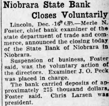 Concluded From Page One 8 Carolina Banks Fail to Open Today the State Bank of Niobrara, at NioNebr. today was here by the department of trade The bank directors voluntarily suspended and turned the institution over to state bank examiner. No reason for action was given. bank had deposits of approximately $275,000. FAILS TO OPEN of the Pope county state bank Golconda for examination and adjustment was announced today. capitalized at $50,000. The first of year the bank had deposits $314,216.41. Loans totaled $244,286.79. PARIS, ILL., FAILURE PARIS, Na. tional at Paris, III., failed its There was run on the bank last Friday. H. Pennell, did not issue statement The bank had capital stock of $50,000. PRESIDENT IS MISSING affairs Andrew president of the state bank of Binghamton, missing since the doors of the institution were closed yesterday, was the object of Inquiry today from sources. The state banking department searching the amount shortage reported to about was one the inFederal officers became interested that Horvatt was the supreme organization and the officers of that organization, the Greek Catholic union, arrived to check their accounts. The exact shortage, state bank examiners might not be determined until early next week. Depositors were largely laborers.