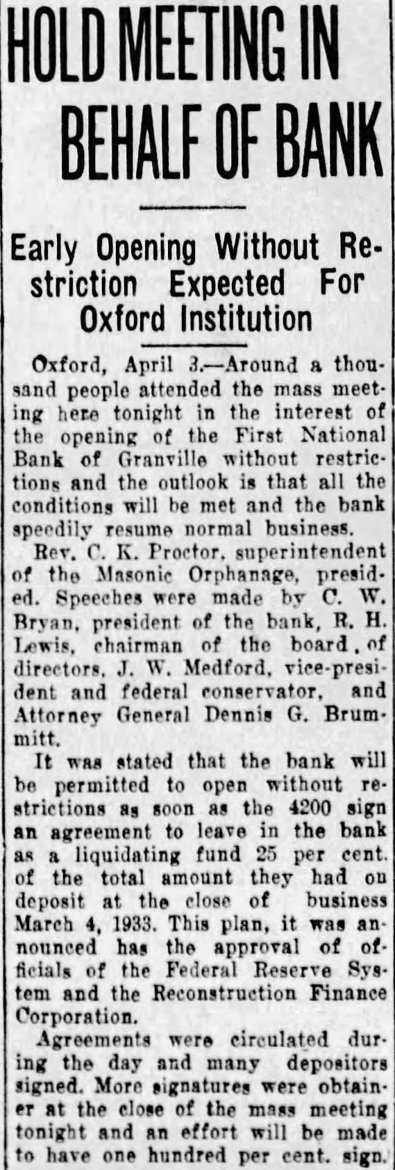 BEHALF BANK Early Opening Without Restriction Expected For Oxford Institution Oxford, April 3.-Around thoupeople attended the meethere tonight in the interest First National opening Bank Granville without restricthe outlook that conditions will met and the bank speedily normal business. Rev. Proctor. superintendent the Masonic Orphanage, presidSpeeches by Bryan, president the bank, Lewis, chairman the Medford. federal Attorney General Dennis G. Brumwas stated that the bank will be permitted open without strictions the agreement to leave the bank liquidating fund per cent. the amount they deposit close business March 1933. This plan, nounced has the approval of ficials the Federal Reserve System and Reconstruction Finance Corporation. Agreements were circulated ing day and many depositors signed. More signatures were obtainthe close the mass meeting tonight and effort will be made to have one hundred per cent. sign.