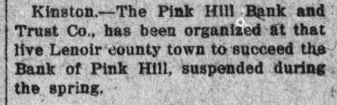 Kinston.-The Pink Hill Bank and Trust Co., has been organized at that live Lenoir county town to succeed the Bank of Pink Hill, suspended during the spring.
