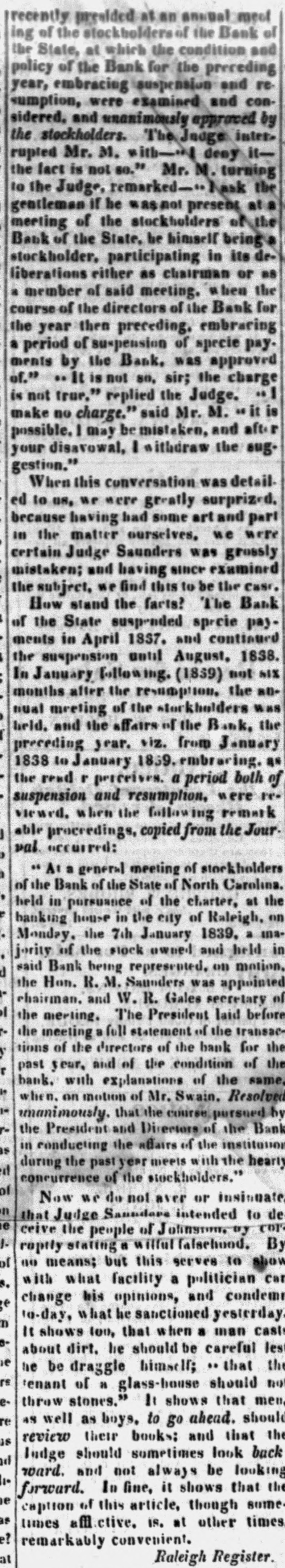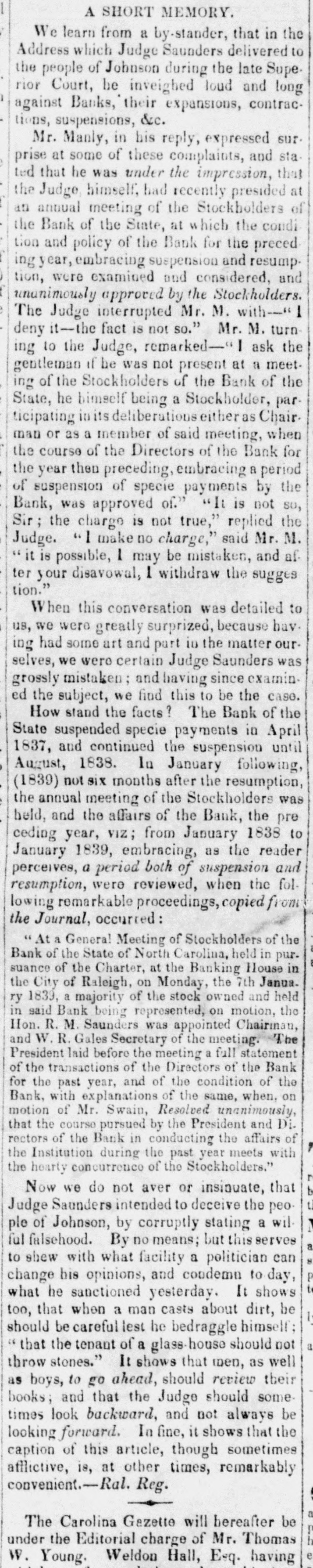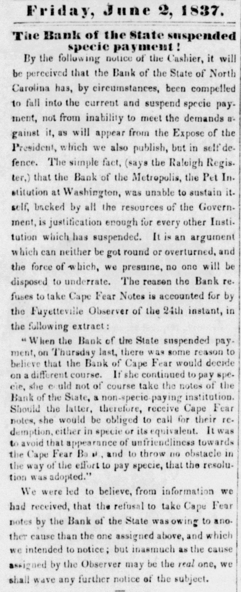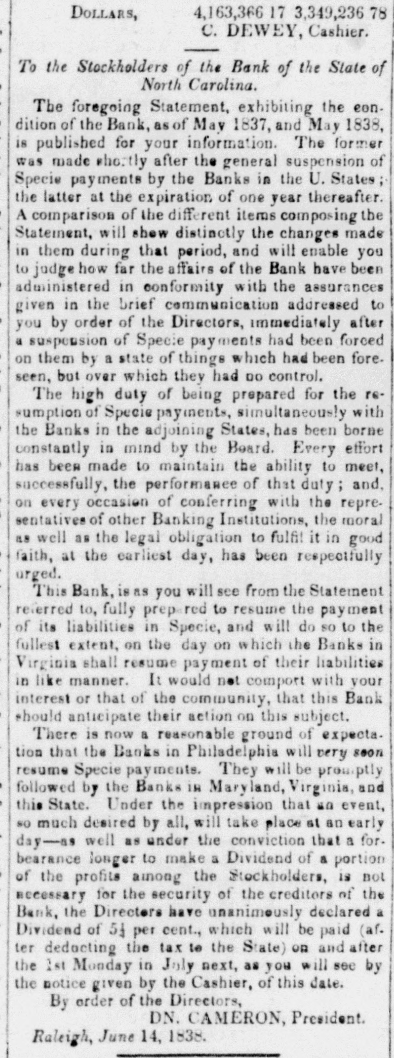 In August, 1837, the Bank of the State of North Carolina, resumed payment, and continued redeeming its paper until Oc-