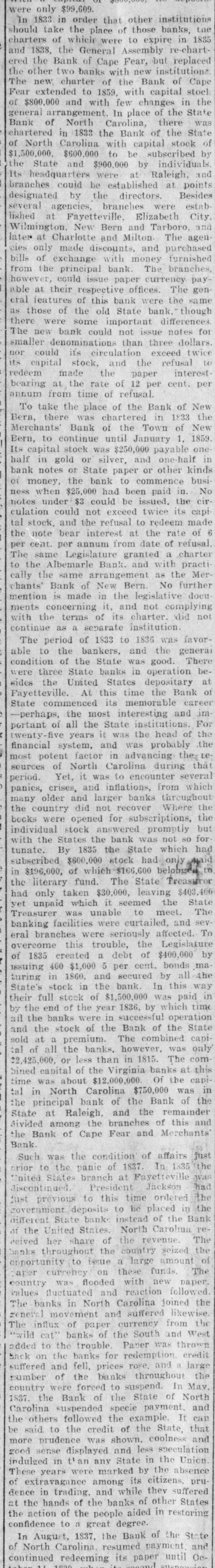 In 1833 in order that other institutions should take the place of those banks, the charters of which were to expire in 1835 and 1838, the General Assembly re-chartered the Bank of Cape Fear, but replaced the other two banks with new institutions. The new charter of the Bank of Cape Fear extended to 1859, with capital stock of $800,000 and with few changes in the general arrangement. In place of the State Bank of North Carolina, there was chartered in 1833 the Bank of the State of North Carolina with capital stock of $1,500,000, $600,000 to be subscribed by the State and $900,000 by individuals. Its headquarters were at Raleigh, and branches could be established at points designated by the directors. Besides several agencies, branches were established at Fayetteville, Elizabeth City, Wilmington, New Bern and Tarboro, and later at Charlotte and Milton. The agencies only made discounts, and purchased bills of exchange with money furnished from the principal bank. The branches, however, could issue paper currency payable at their respective offices. The general features of this bank were the same as those of the old State bank, though there were some important differences. The new bank could not issue notes for smaller denominations than three dollars, nor could its circulation exceed twice its capital stock, and the refusal to redeem made the paper interest-bearing at the rate of 12 per cent. per annum from time of refusal.
