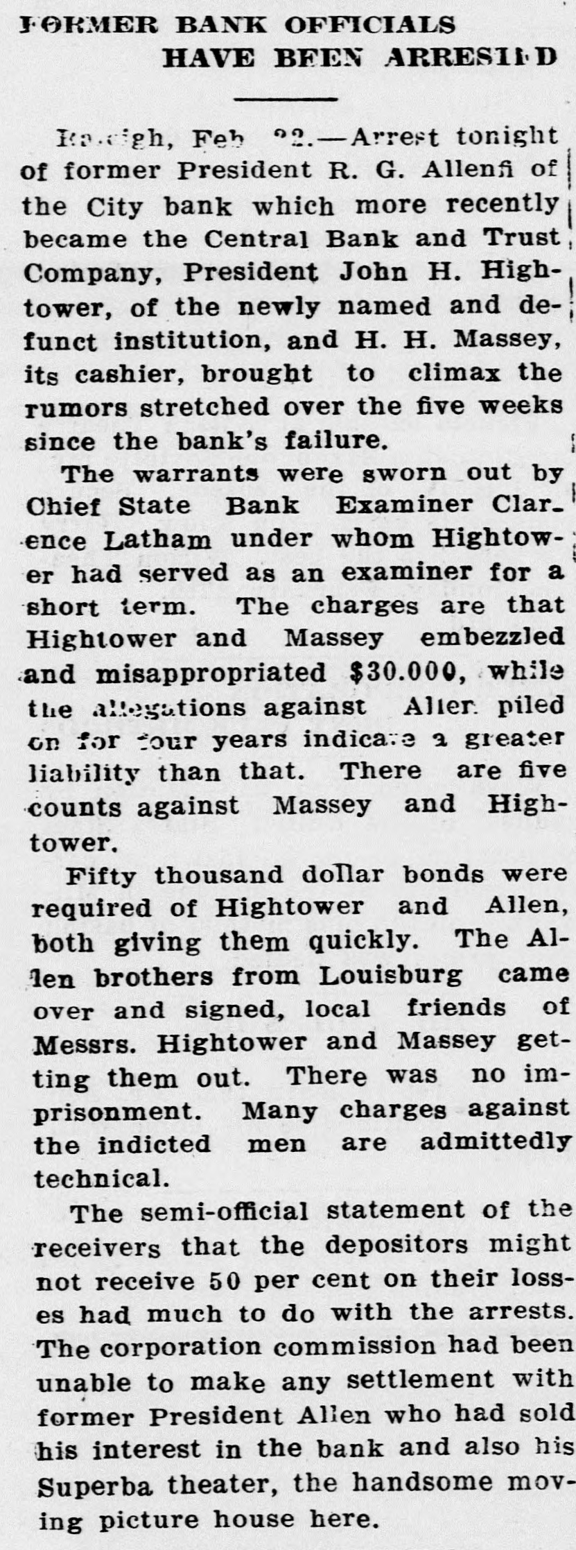 JORMER BANK OFFICIALS HAVE BEEN ARRESID Raidigh, Feb 2.2-Arrest tonight of former President R. G. Allenfi of the City bank which more recently became the Central Bank and Trust Company, President John H. Hightower, of the newly named and defunct institution, and H. H. Massey, its cashier, brought to climax the rumors stretched over the five weeks since the bank's failure. The warrants were sworn out by Chief State Bank Examiner Clar_ ence Latham under whom Hightower had served as an examiner for a short term. The charges are that Hightower and Massey embezzled and misappropriated $30.000, while the allegations against Alier. piled on for four years indica.e a greater liability than that. There are five counts against Massey and Hightower. Fifty thousand dollar bonds were required of Hightower and Allen, both giving them quickly. The Allen brothers from Louisburg came over and signed, local friends of Messrs. Hightower and Massey getting them out. There was no imprisonment. Many charges against the indicted men are admittedly technical. The semi-official statement of the receivers that the depositors might not receive 50 per cent on their losses had much to do with the arrests. The corporation commission had been unable to make any settlement with former President Allen who had sold his interest in the bank and also his Superba theater, the handsome moving picture house here.