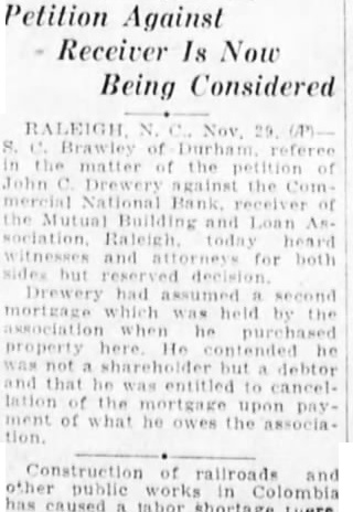 Petition Against Receiver Is Now Being Considered C. Brawley of the matter of the of John C. Drewery against the Commercial National Bank. of the Mutual Building and Loan Association Raleigh today heard witnesses and attorneys for both but had second mortgage held by the association he purchased property here. He contended he not shareholder but debtor and that he was entitled to cancellation the mortgage upon pay ment of what he owes the association. Construction of railroads and public works in Colombia